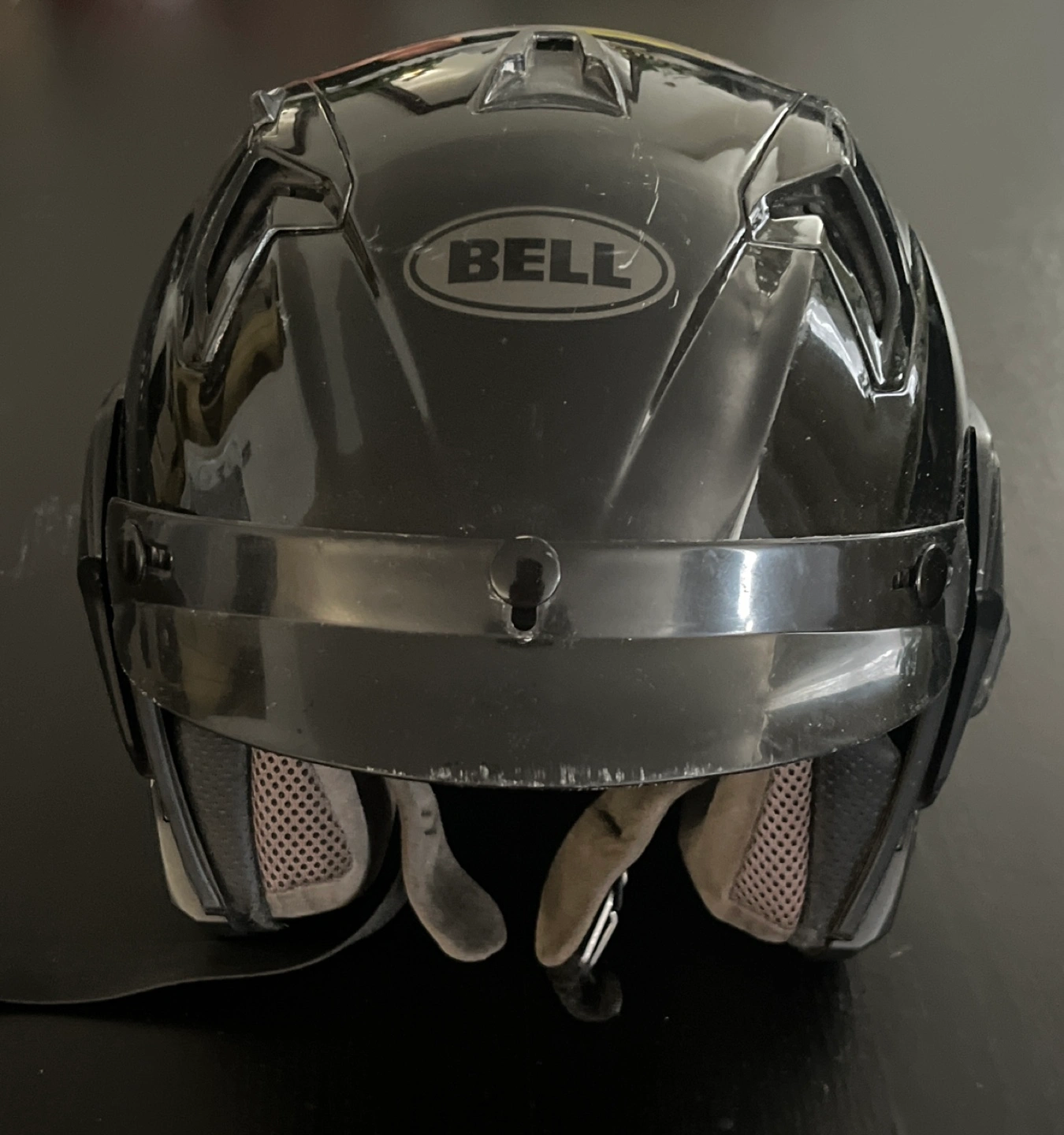 Black Bell MAG-9 Sena motorcycle helmet. DOT approved. Features a flip-up visor and comfortable interior padding. Shows some minor wear.