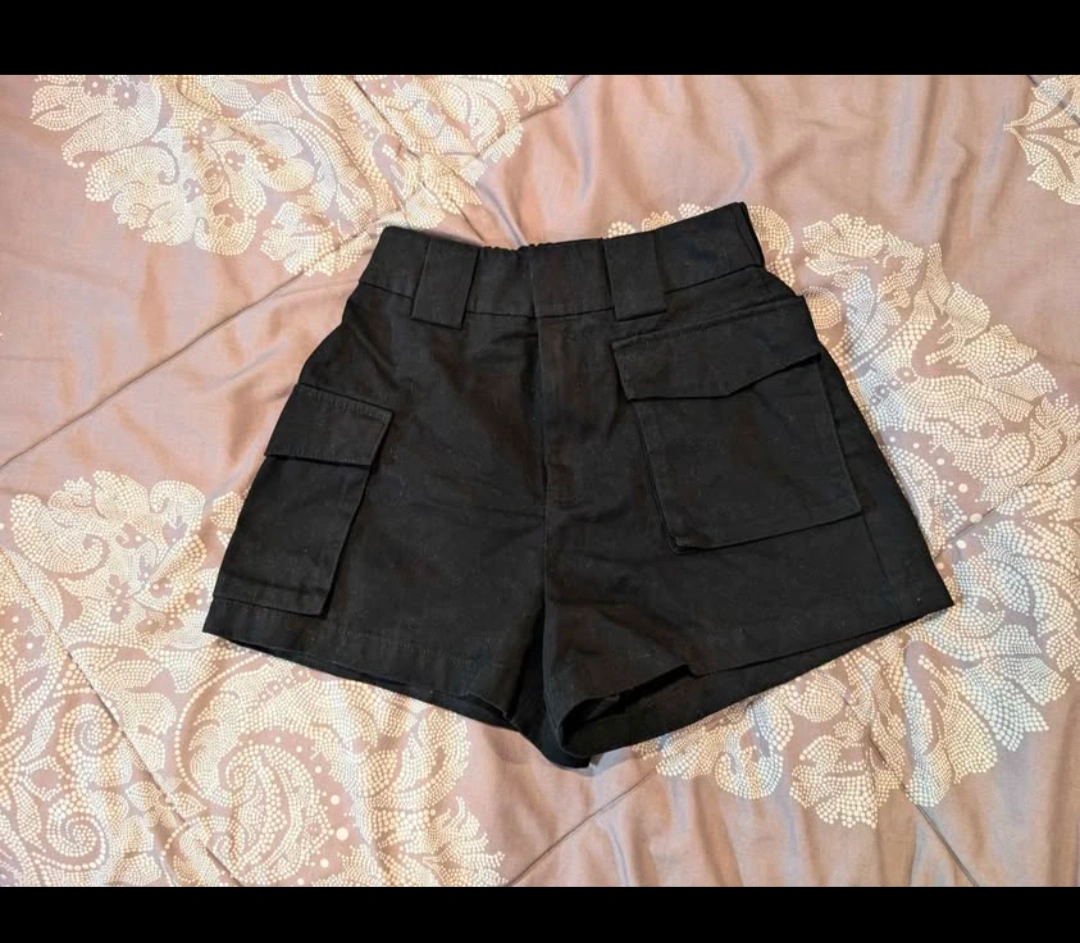 Women's black cargo shorts. Elastic waistband. Multiple pockets. Great for summer.