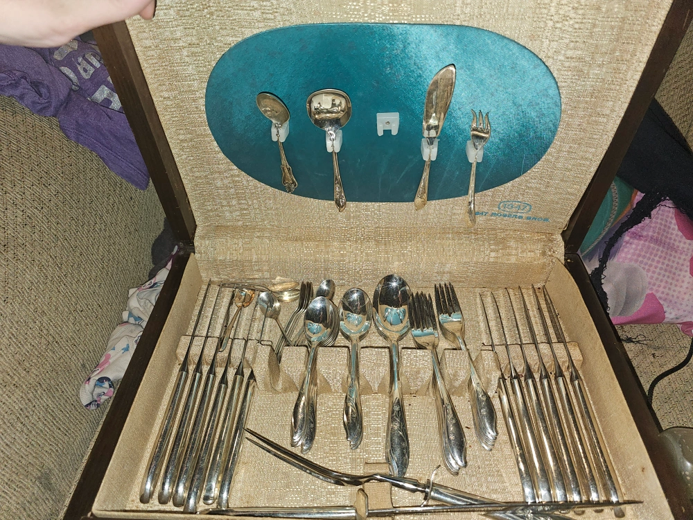 Beautiful vintage silverplate flatware set. Complete set in original wooden case. Includes spoons, forks, knives, and serving pieces. Some tarnish, but overall good condition.