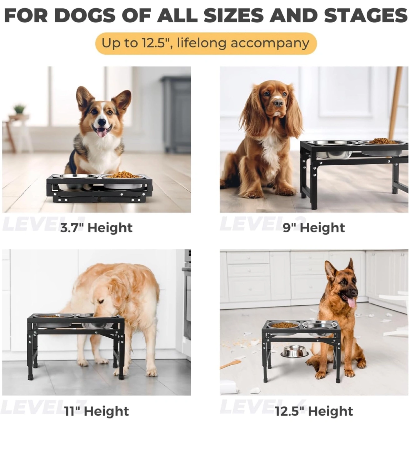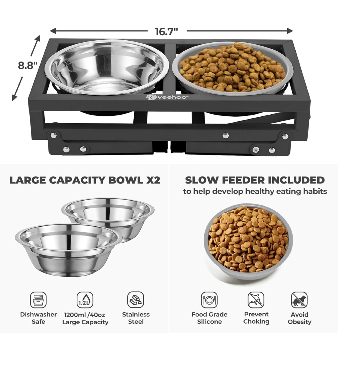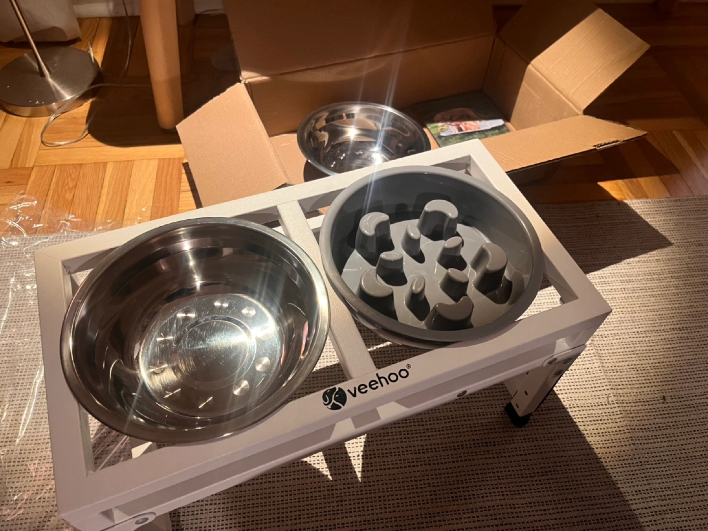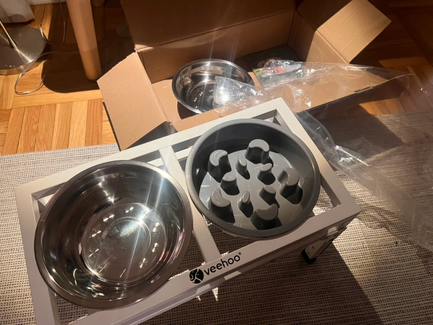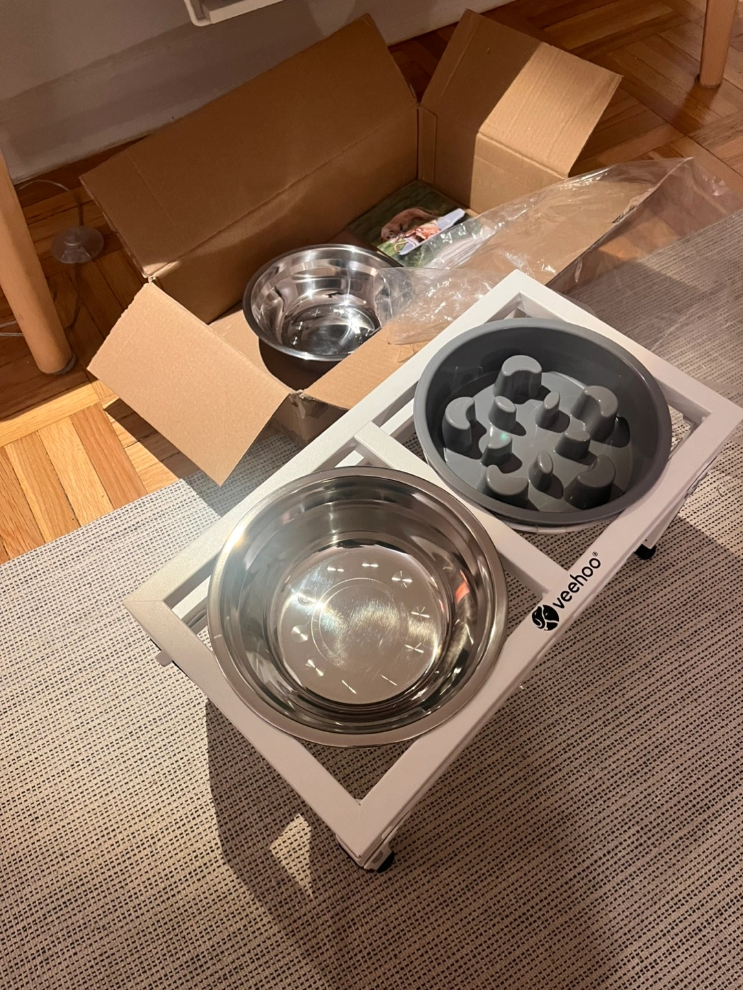 Adjustable height dog feeder. Includes two stainless steel bowls and a slow feeder bowl. Dishwasher safe. Great for dogs of all sizes. Pickup close to Davisville subway station, 6min walk.