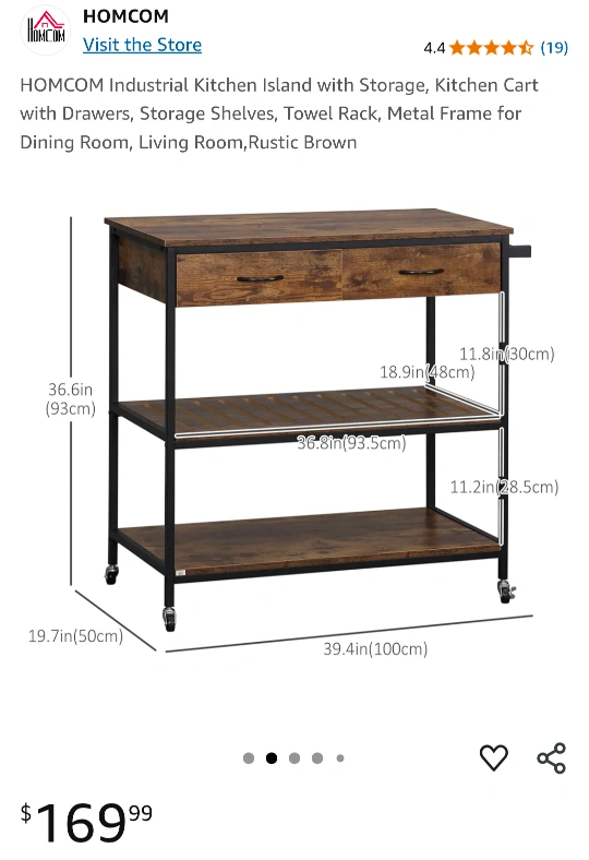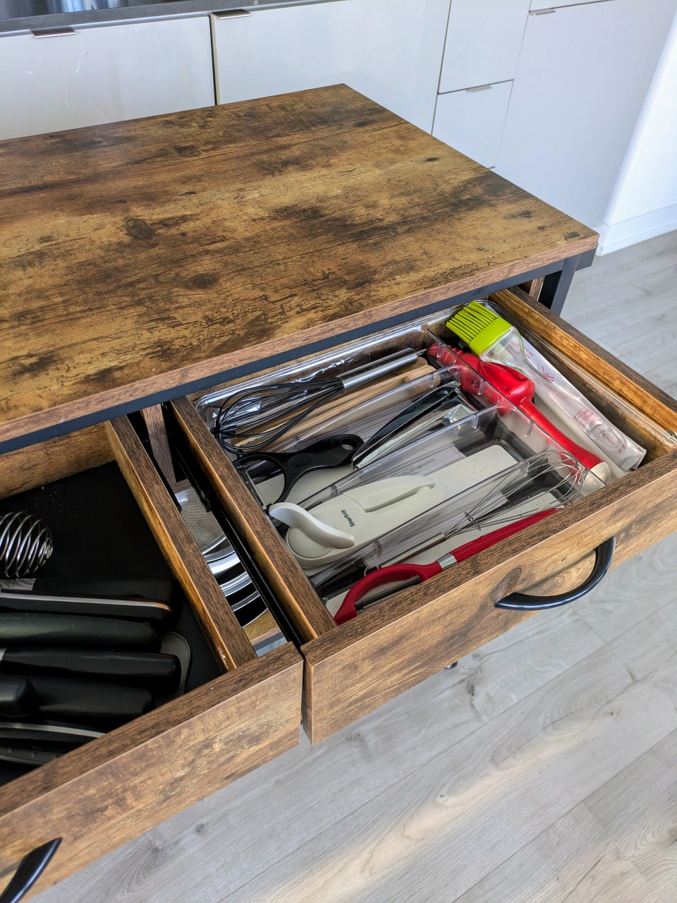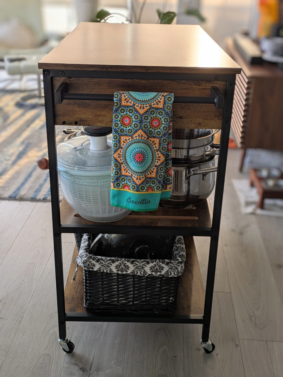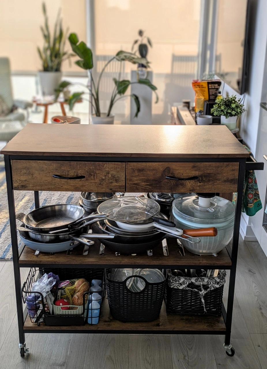 Sturdy rolling kitchen cart with two drawers, one slatted shelf and one solid shelf. Black metal frame, brown wood top. In spotless condition, less than one year old. Great for extra counter space and storage. Dimensions in last photo. Purchased new for 170 + tax. Moving sale - check out my other listings ✨