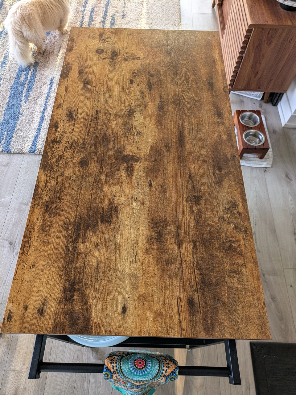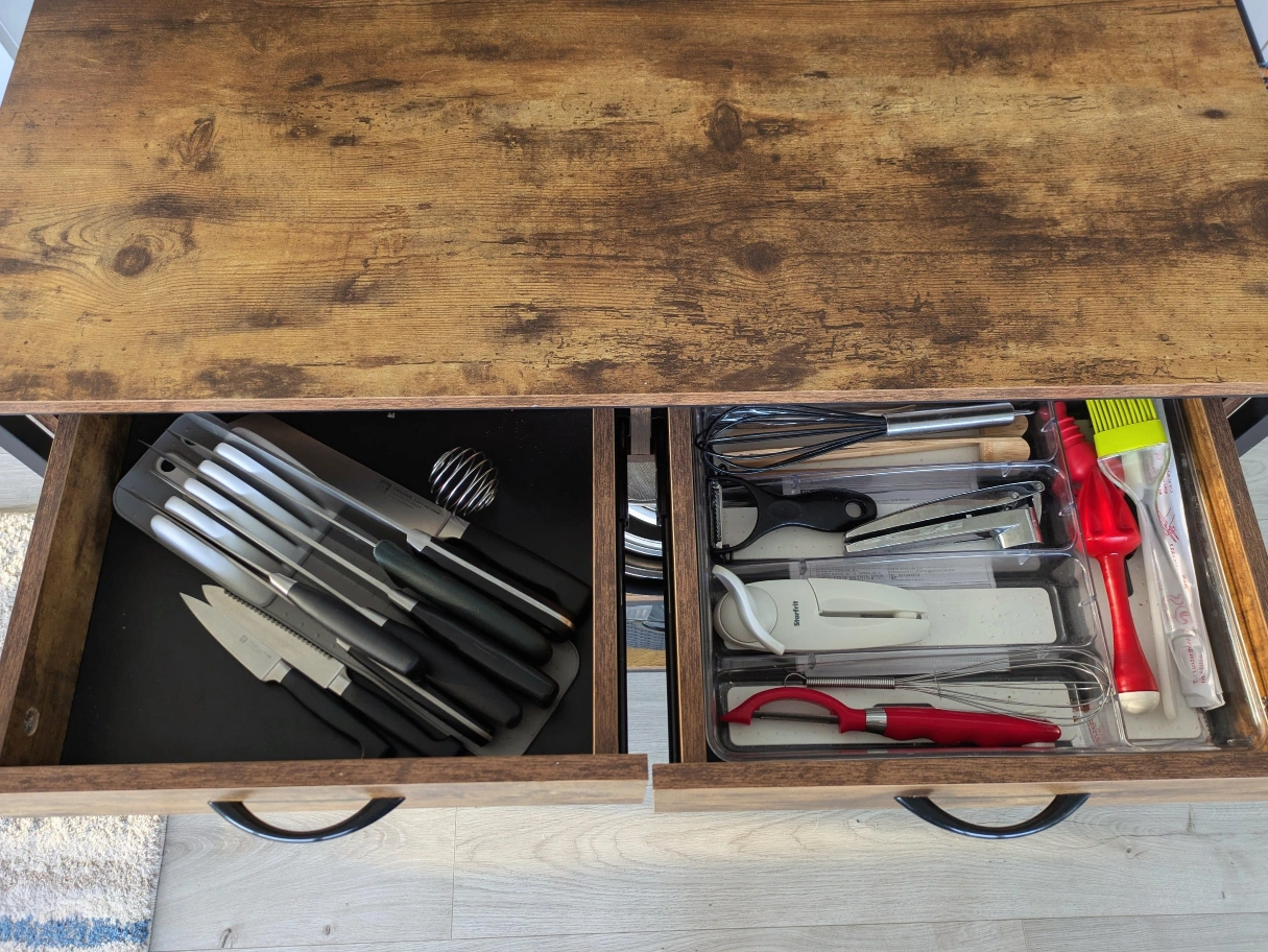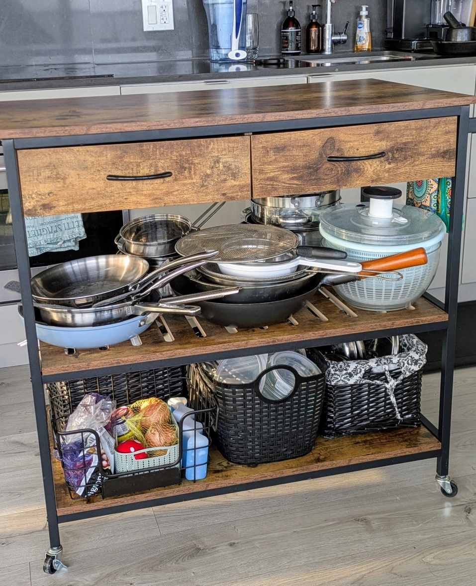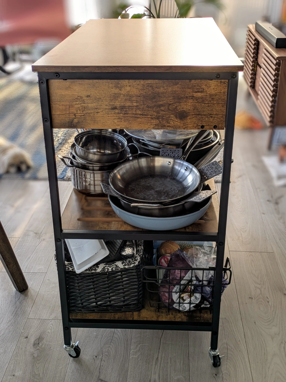 Sturdy rolling kitchen cart with two drawers, one slatted shelf and one solid shelf. Black metal frame, brown wood top. In spotless condition, less than one year old. Great for extra counter space and storage. Dimensions in last photo. Purchased new for 170 + tax. Moving sale - check out my other listings ✨