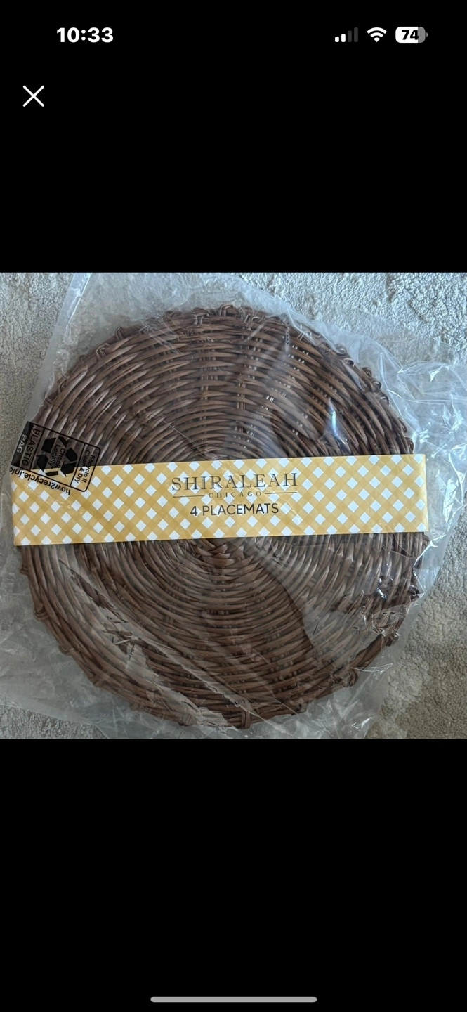 New in package set of four brown woven placemats. Perfect for adding a touch of rustic elegance to your table. Materials: Polypropylene Dimensions: 15 x 15 x 15 in.