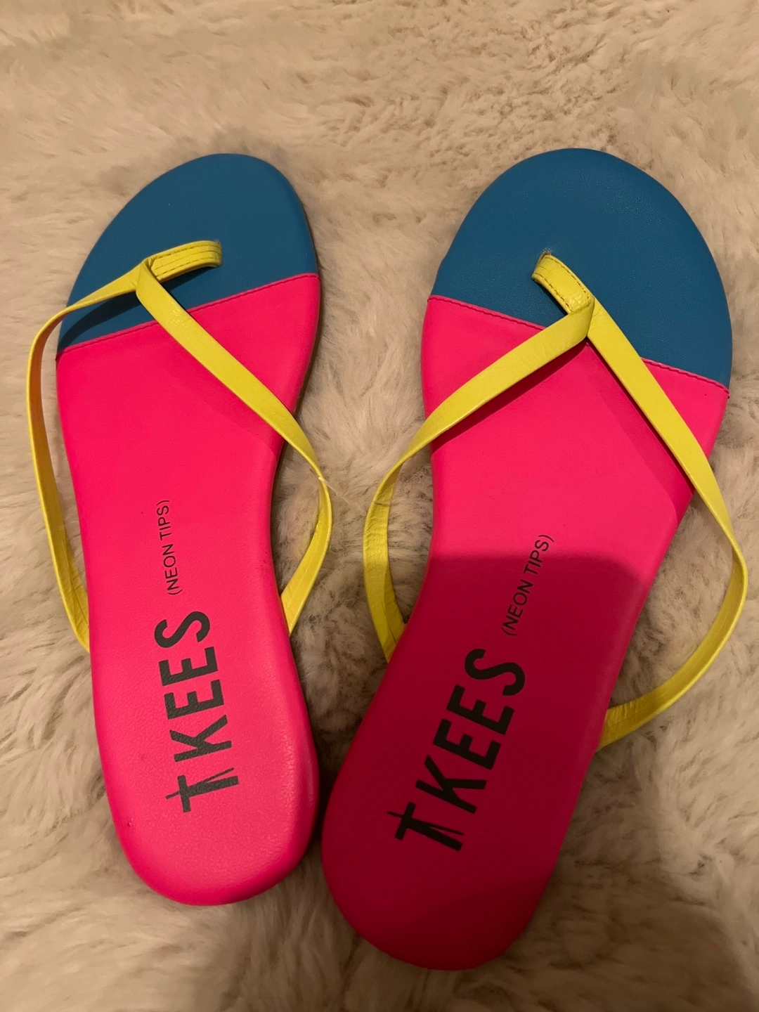 New without tags. Pair of Tkees flip-flops. Pink and teal. Neon yellow straps. Great for summer. USA SIZE 5 - fits 5-6 USA size EUR SIZE 36