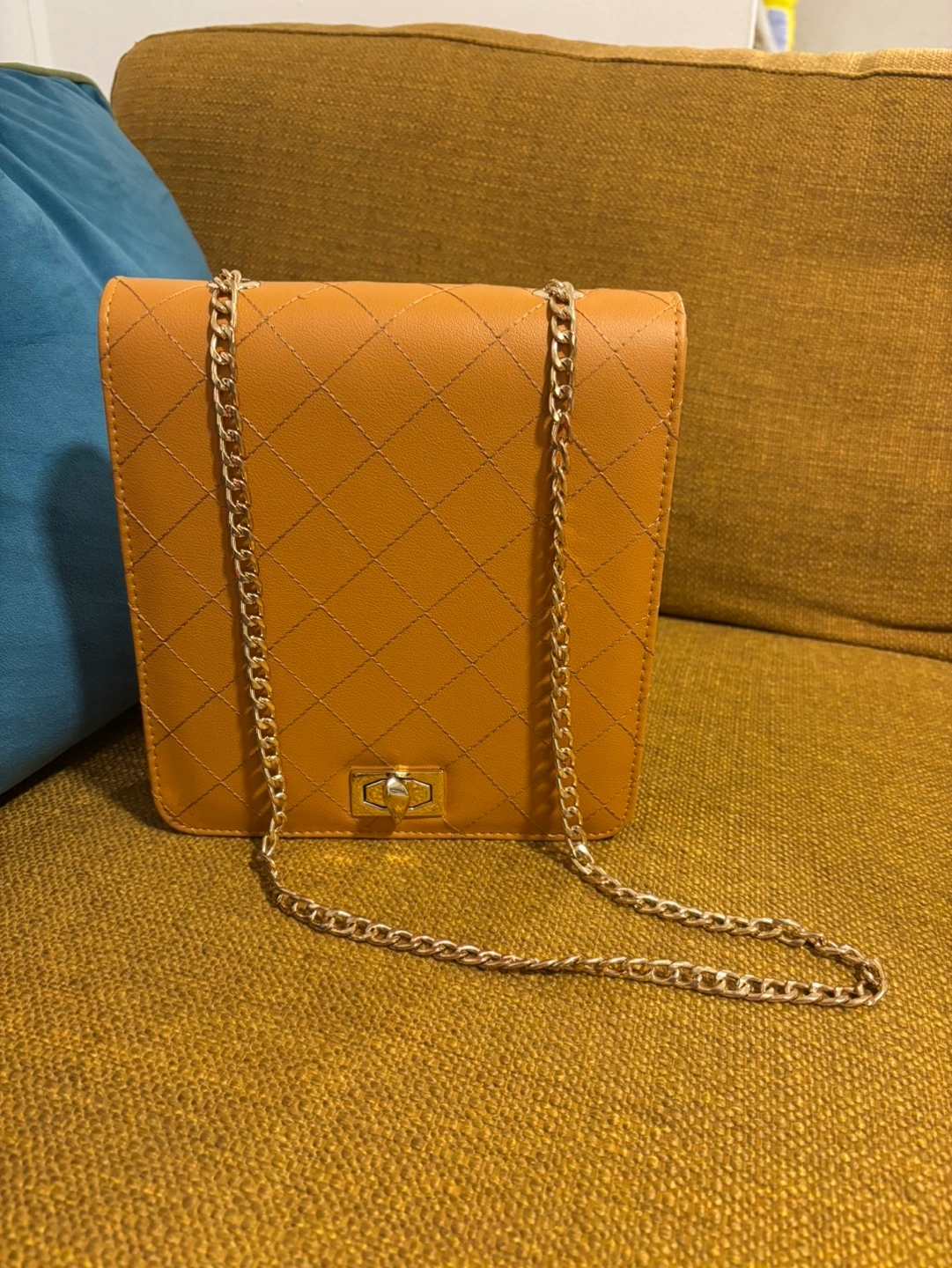 Small mustard yellow crossbody bag. Features a gold chain strap and quilted design. Magnetic closure.