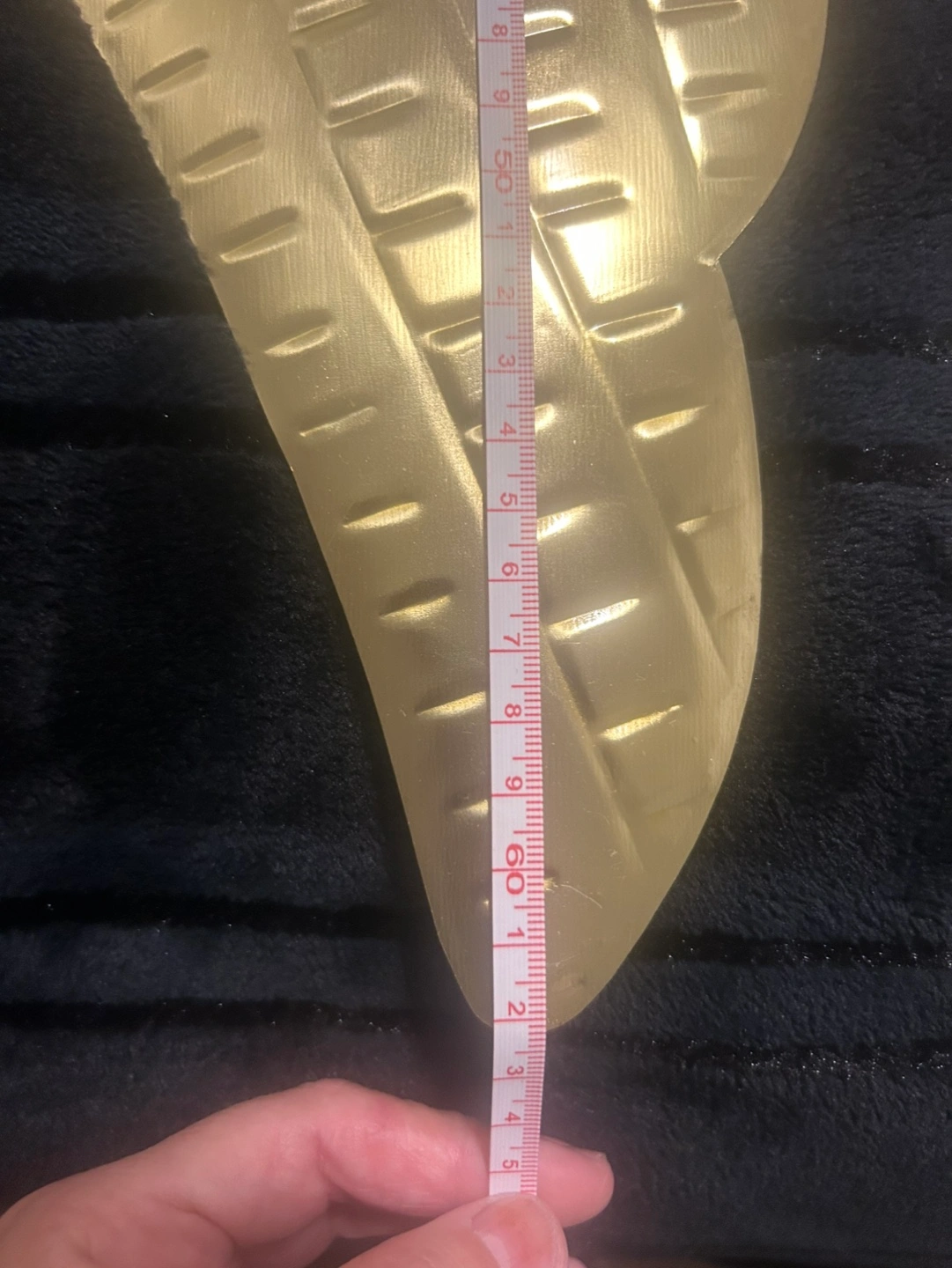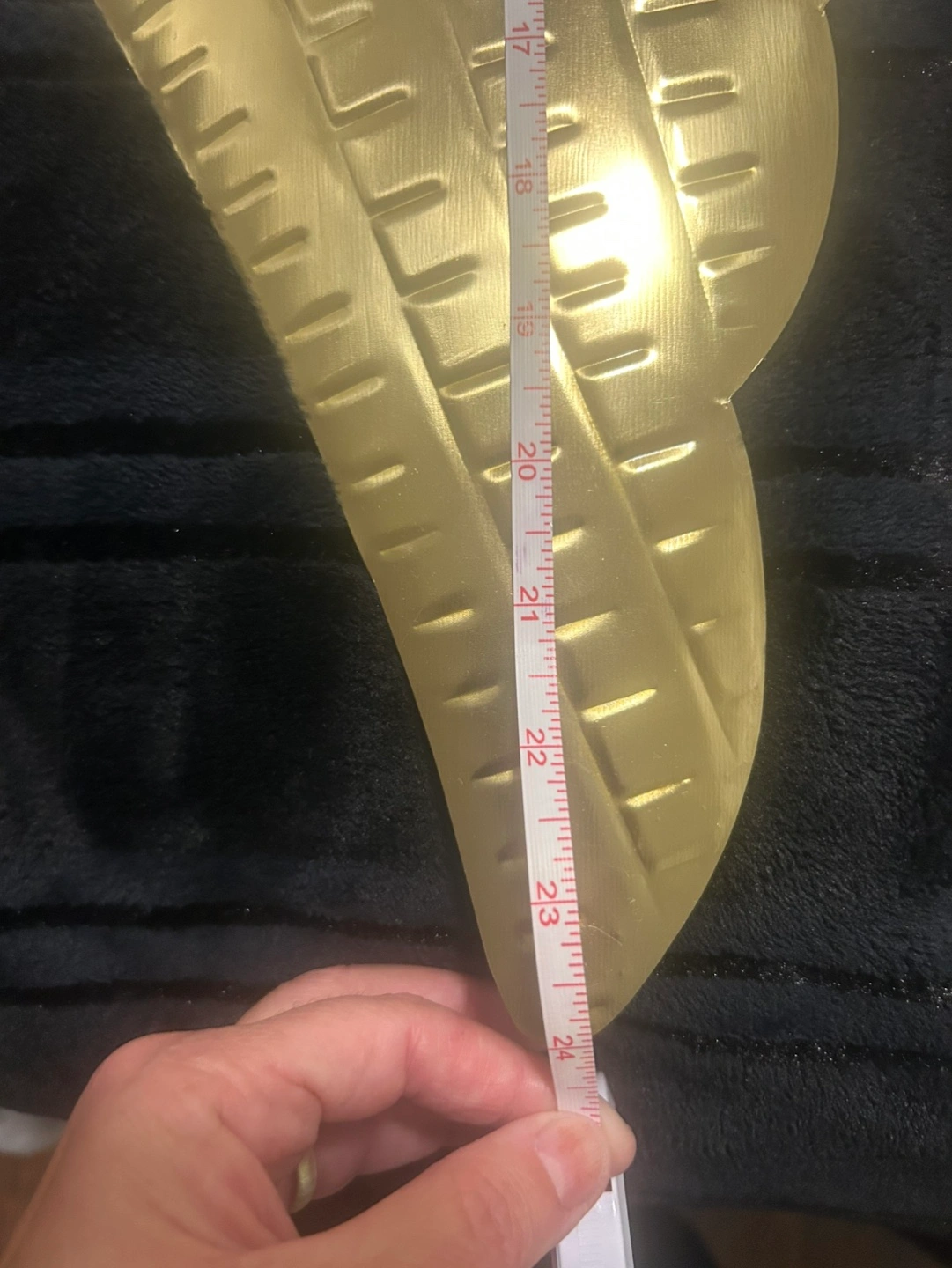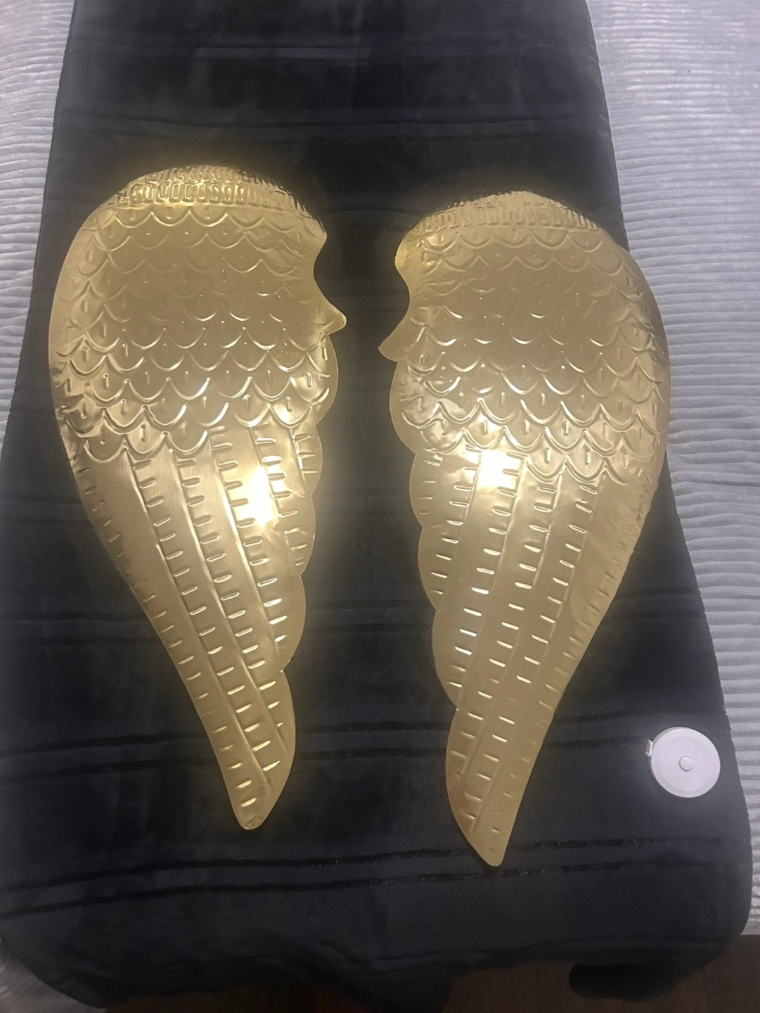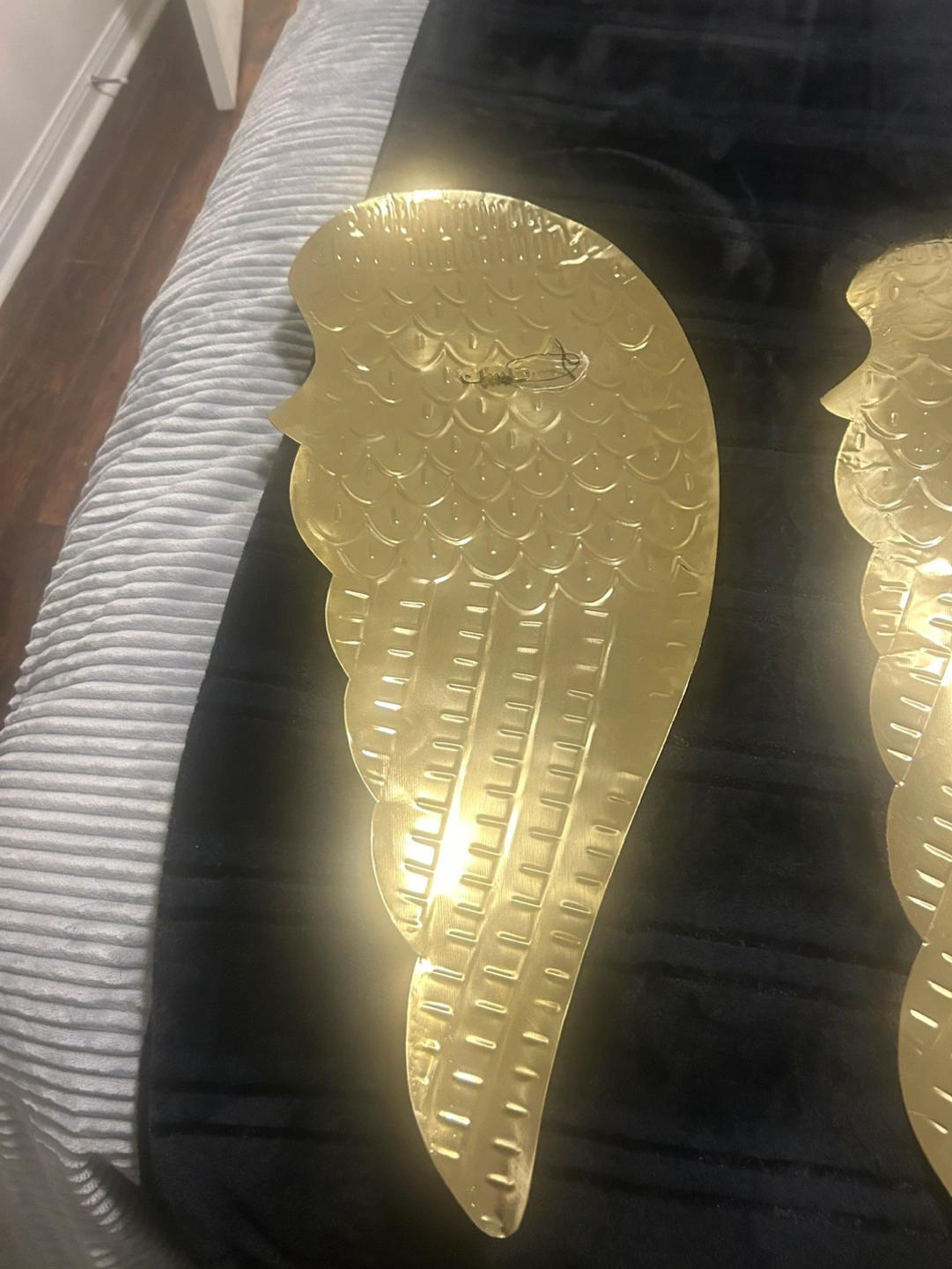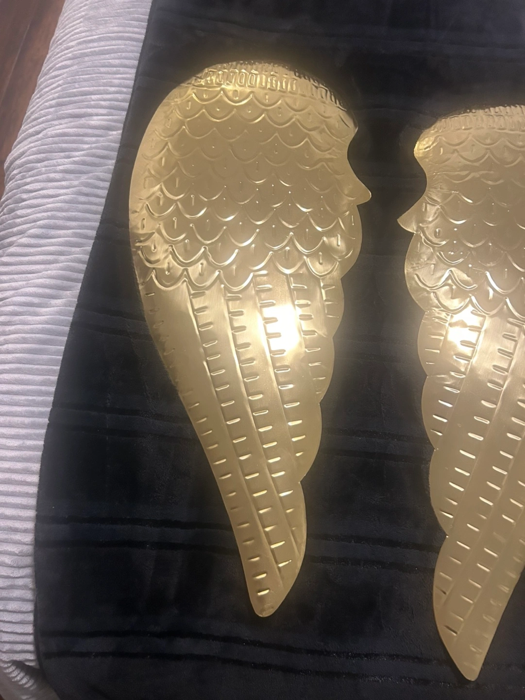 Pair of gold metal angel wings. Intricate detailing. Perfect for wall decor. Approximately 24”inches tall.