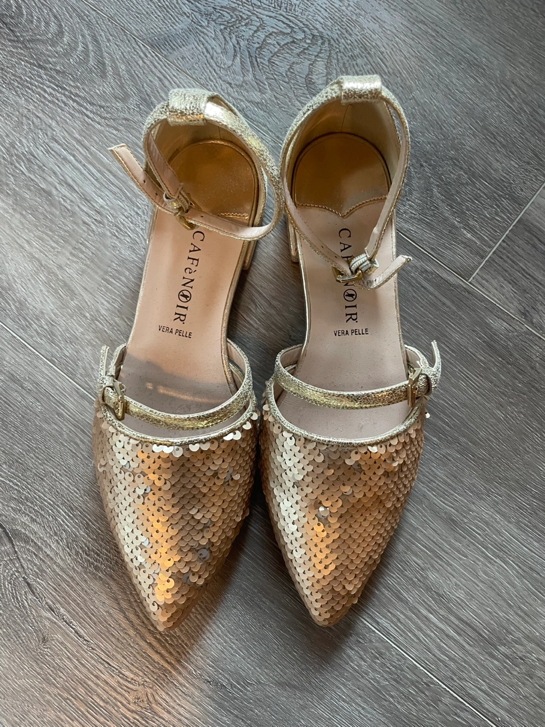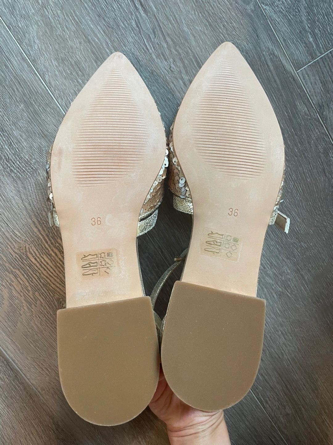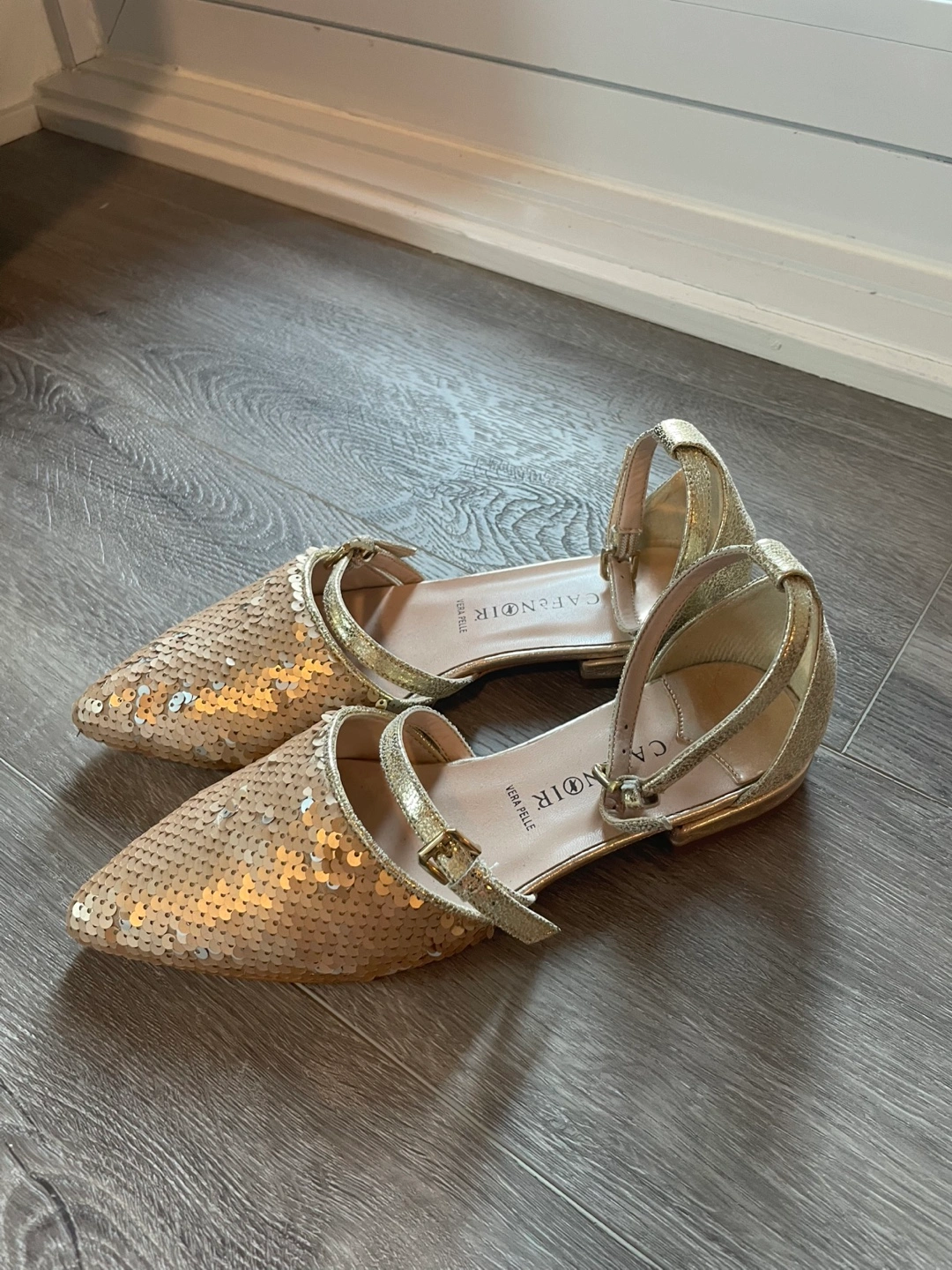 Gorgeous gold sequin ballet flats. Size 36. Ankle strap closure. Pointed toe. Never worn