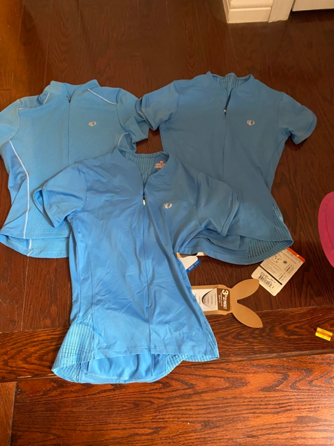 Three brand new Pearl Izumi women's cycling jerseys. Size xsmall. Light blue colour. Short sleeves. Full zip. Mesh panels for ventilation. Rear pockets. Each jersey retail over $100 Perfect for cycling enthusiasts. Cash only
