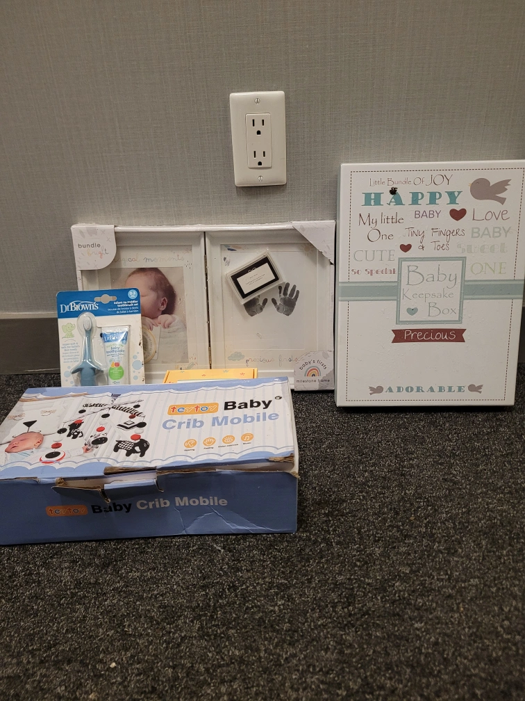 ( FREE) Adorable baby bundle includes keepsake box, crib mobile, two picture frames,, and more. Perfect for a baby shower gift or to remember those precious first moments. **** Pickup Only **** **** First Come/ First Serve **** **** No Holds/ No Reserves unless purchasing additional item ****