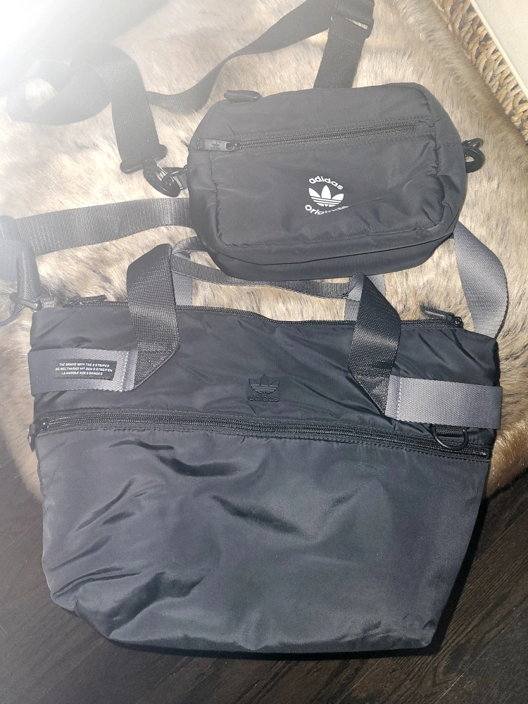 Black Adidas Originals bags. Small crossbody bag and larger tote. Both have adjustable straps. Zipper closures. Minimal wear.
