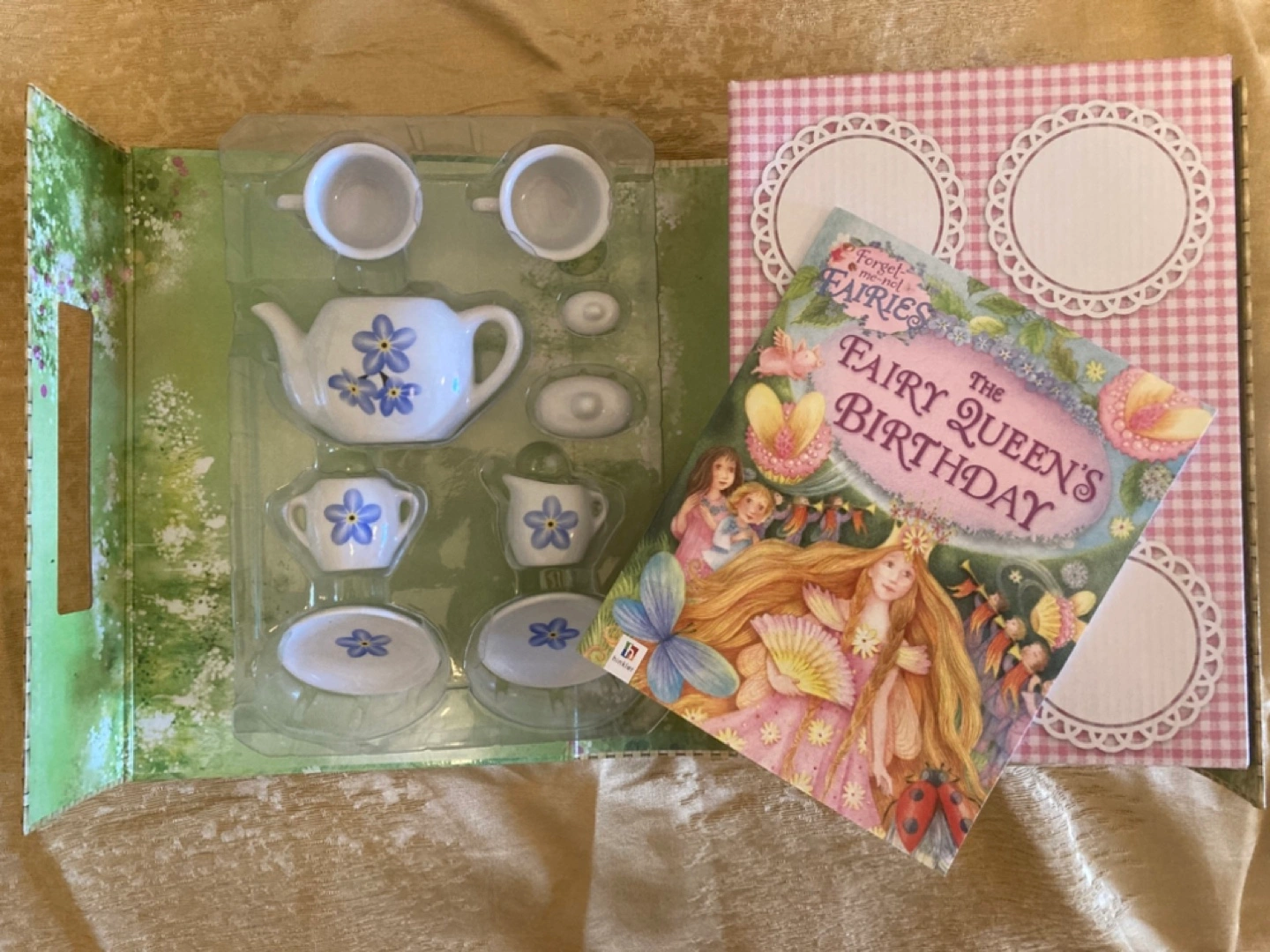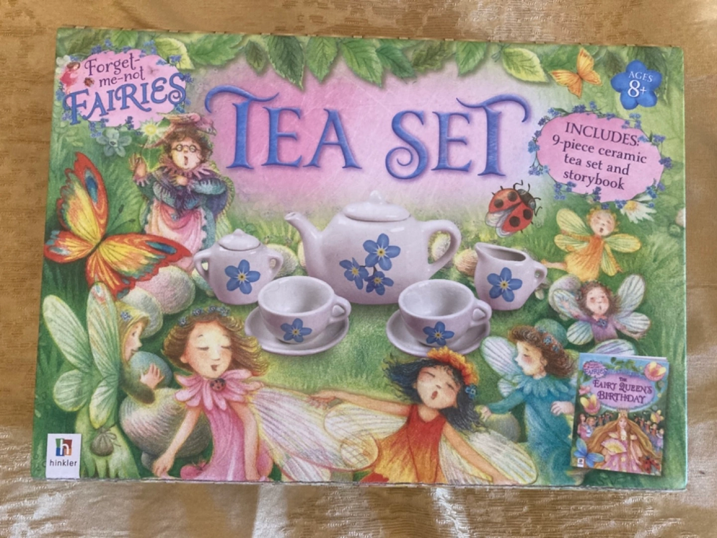 Nine-piece ceramic tea set. Includes teapot, cups, saucers, creamer, and sugar bowl. Storybook included. Ages 8+