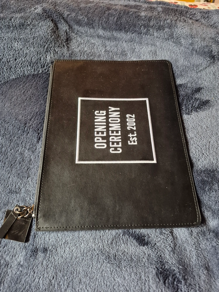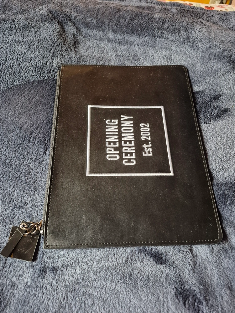 Black leather-look zipper pouch. Features embroidered logo. Great for travel or everyday use.