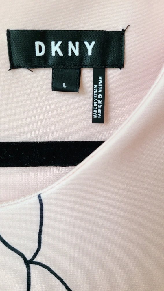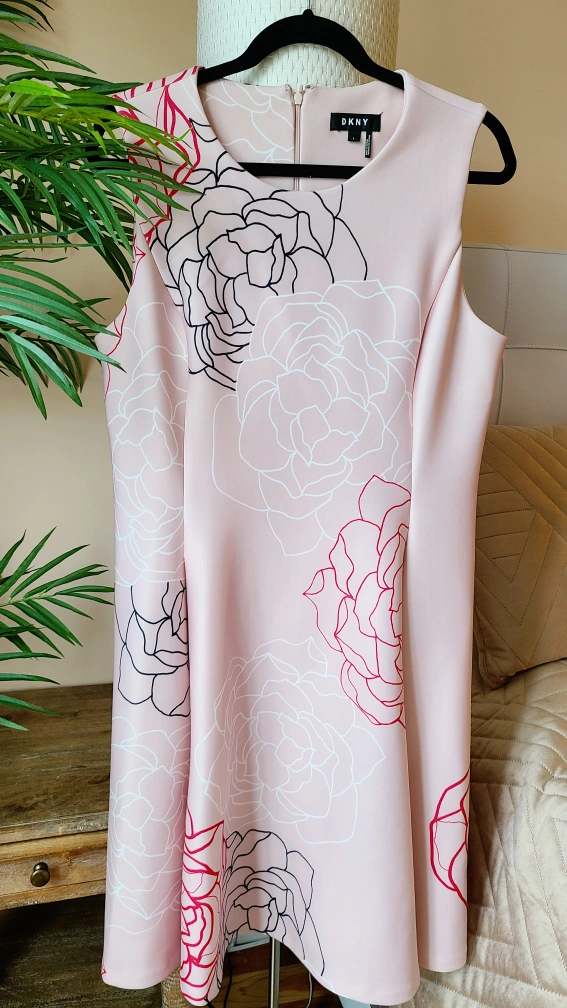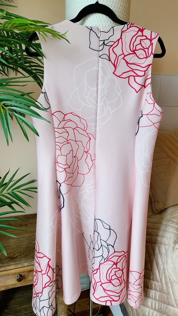 Beautiful blush pink sleeveless dress. Features a floral pattern in red and white. A-line silhouette. Size Large.