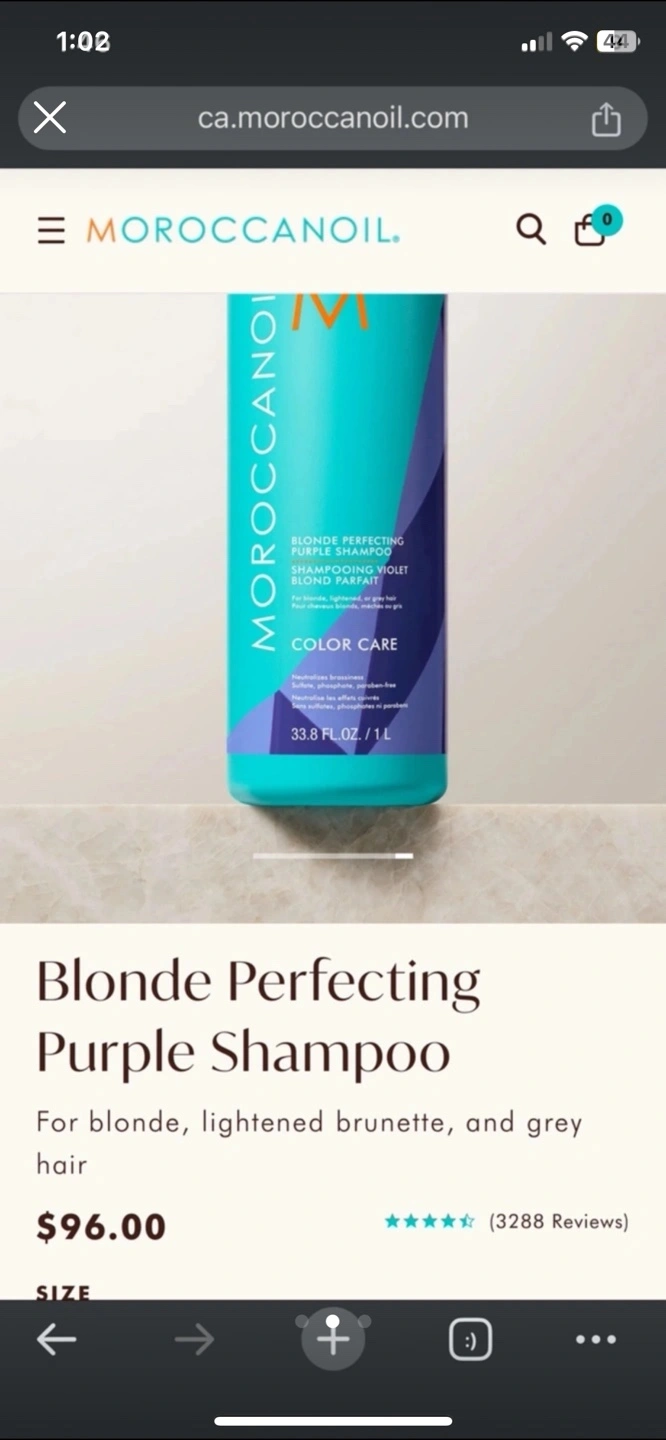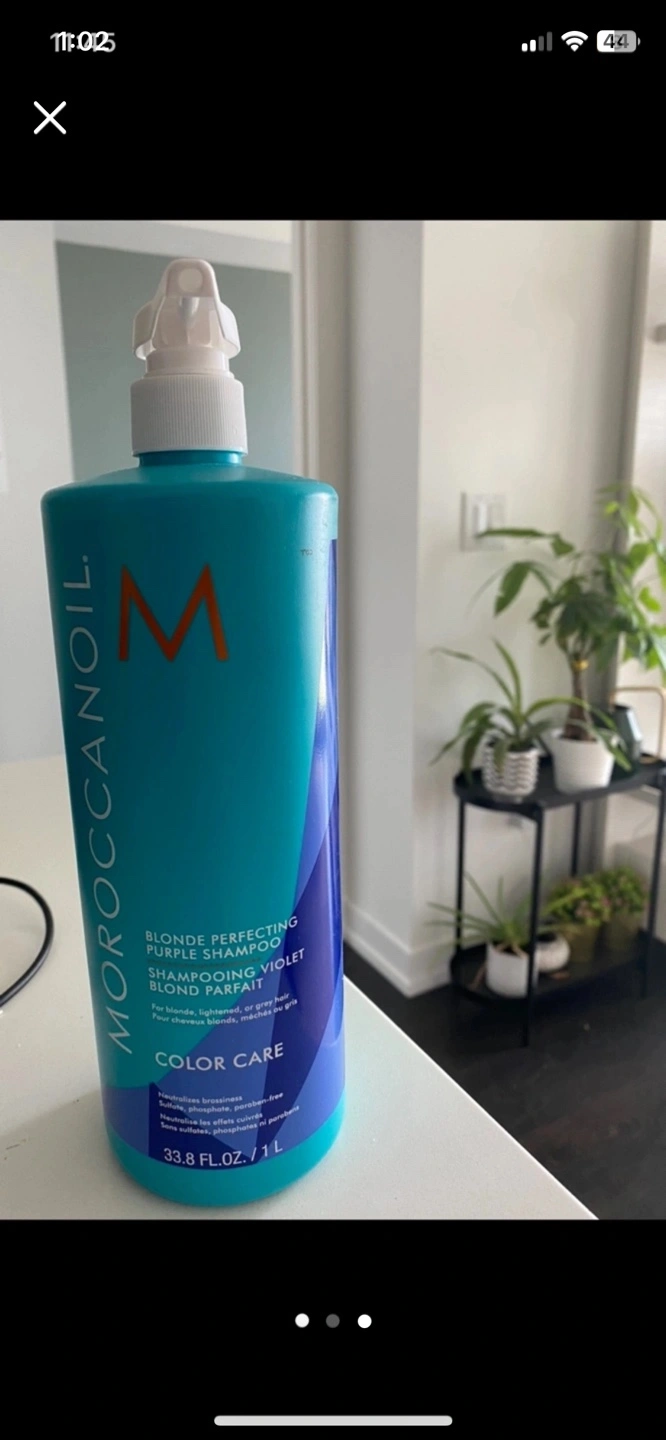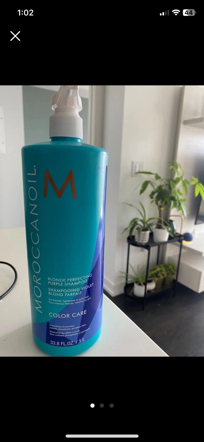 Large bottle of Moroccanoil Blonde Perfecting Purple Shampoo. For blonde, lightened brunette, and grey hair. Colour care. 1L bottle.