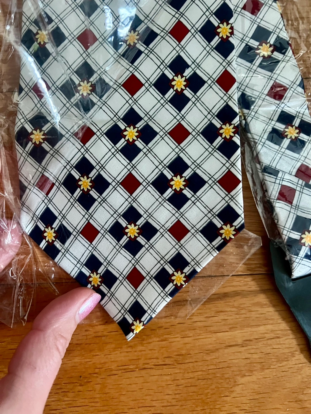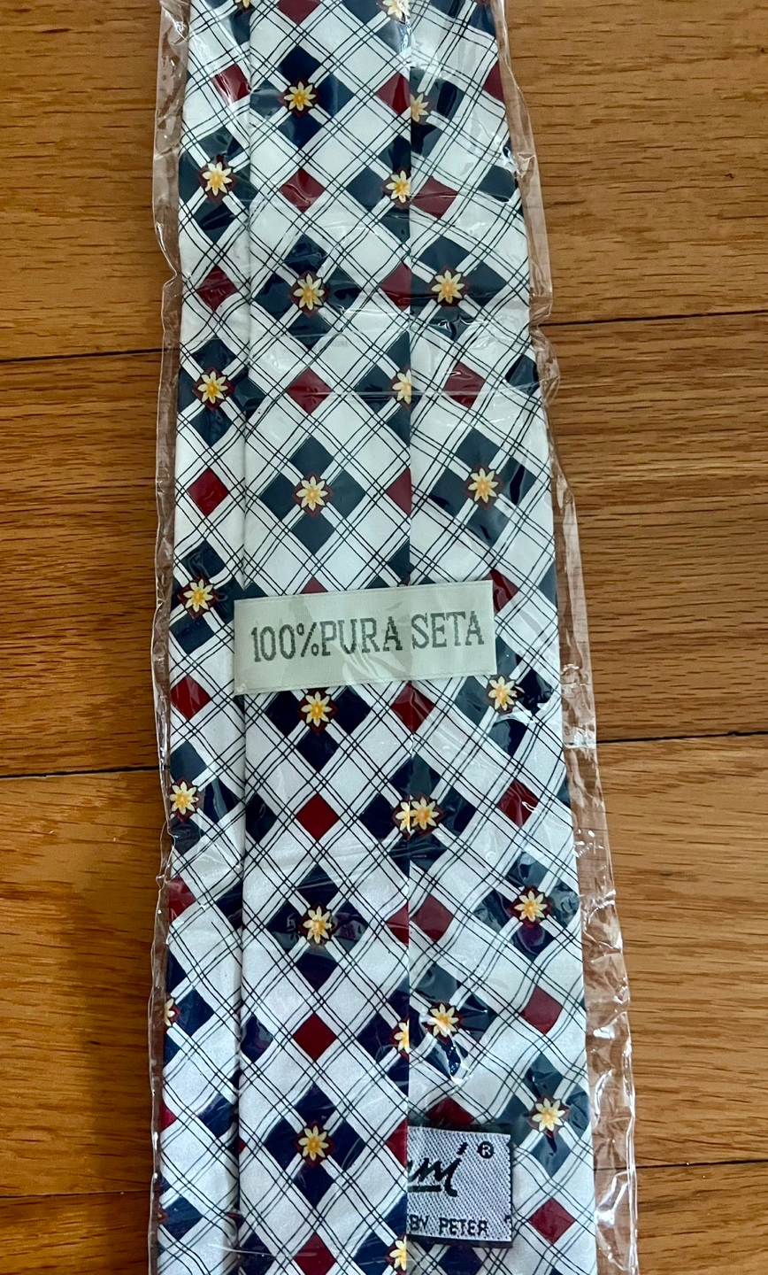New men's tie. 100% pure silk. Floral pattern on a white background with navy and burgundy accents. Still in original packaging. Lakeshore and parklawn Queen and ossington (some days) Open to trades
