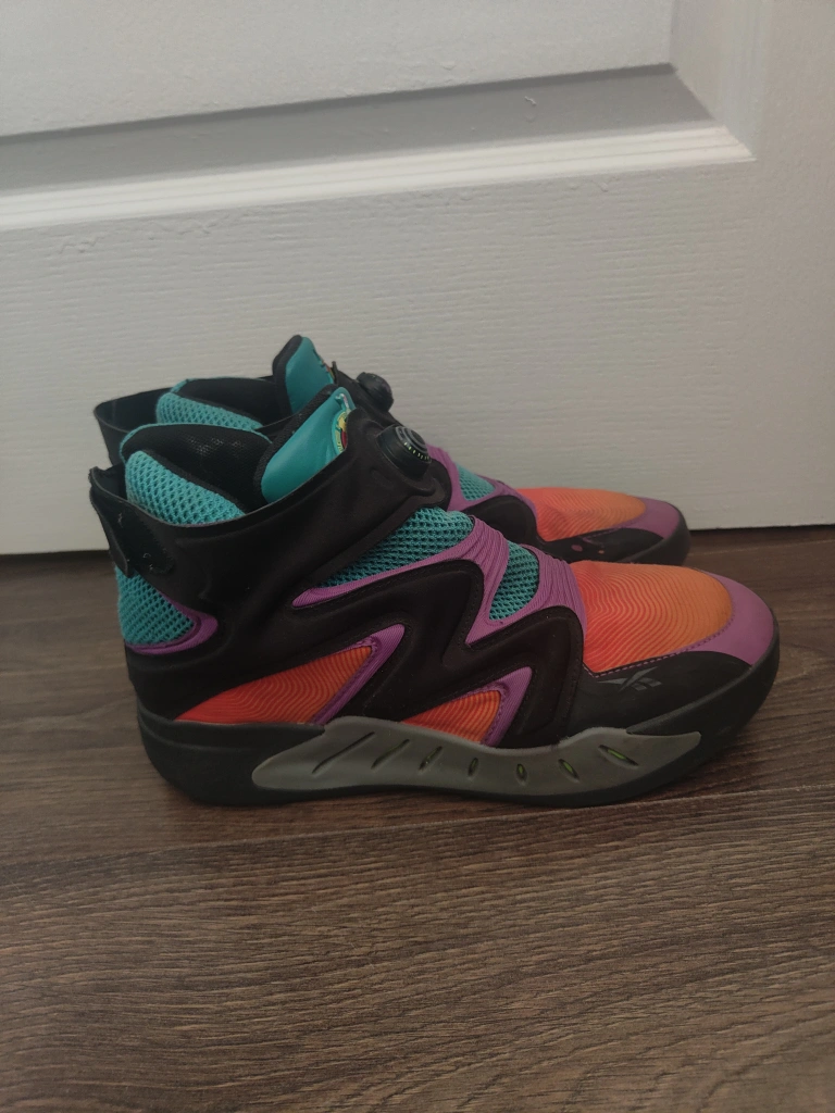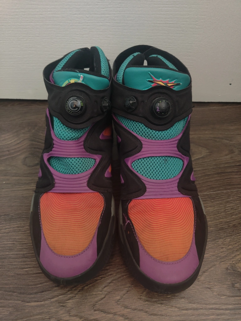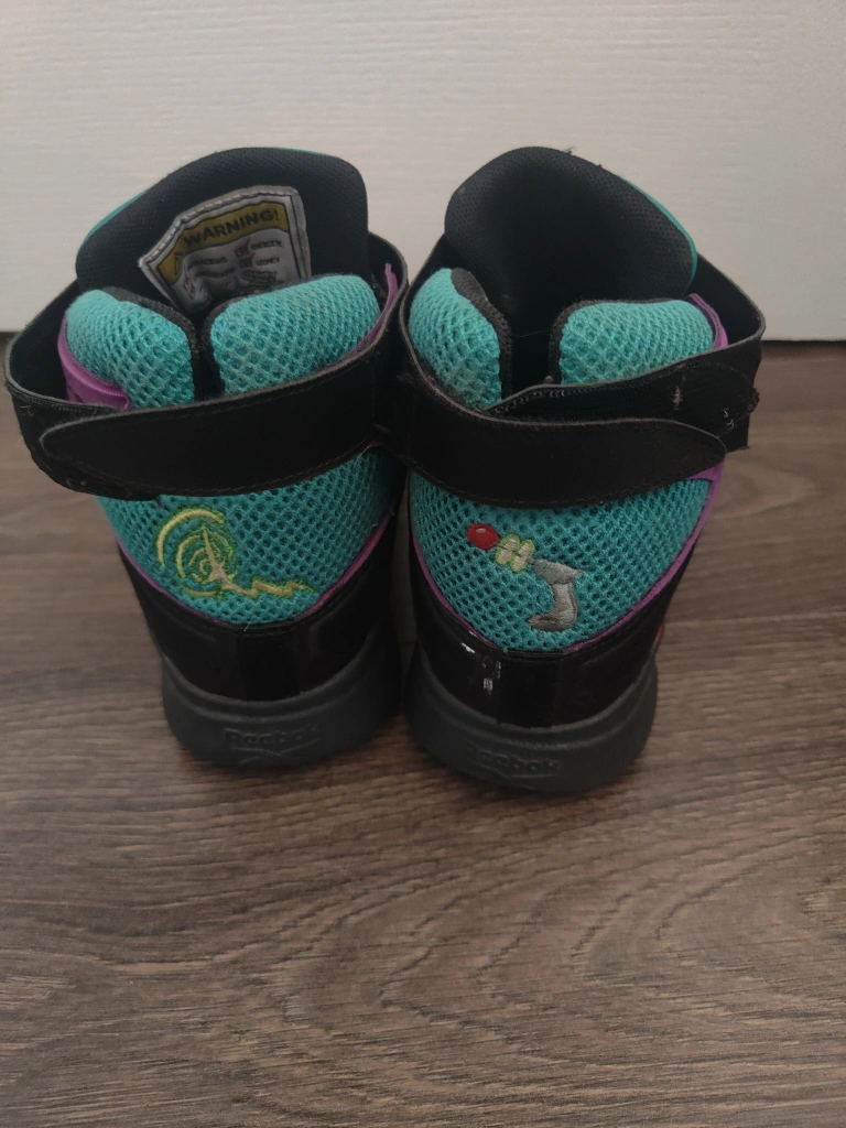 This is an original pair of Reebok Instapump Fury Zone - a limited edition for the Space Jam fans out there as they're Looney Tunes' Marvin the Martian! They're crafted from breathable mesh panelling and are fitted with the pump that allows a customisable fit. The pair are complete with a comfortable EVA midsole and a rubber sole. Highlights: black/multicolour mesh panelling panelled design logo patch at the tongue embroidered logo to the rear round toe EVA midsole rubber sole Lightly used in the basketball court indoors - please check the insole, one of the front inserts and the soles.