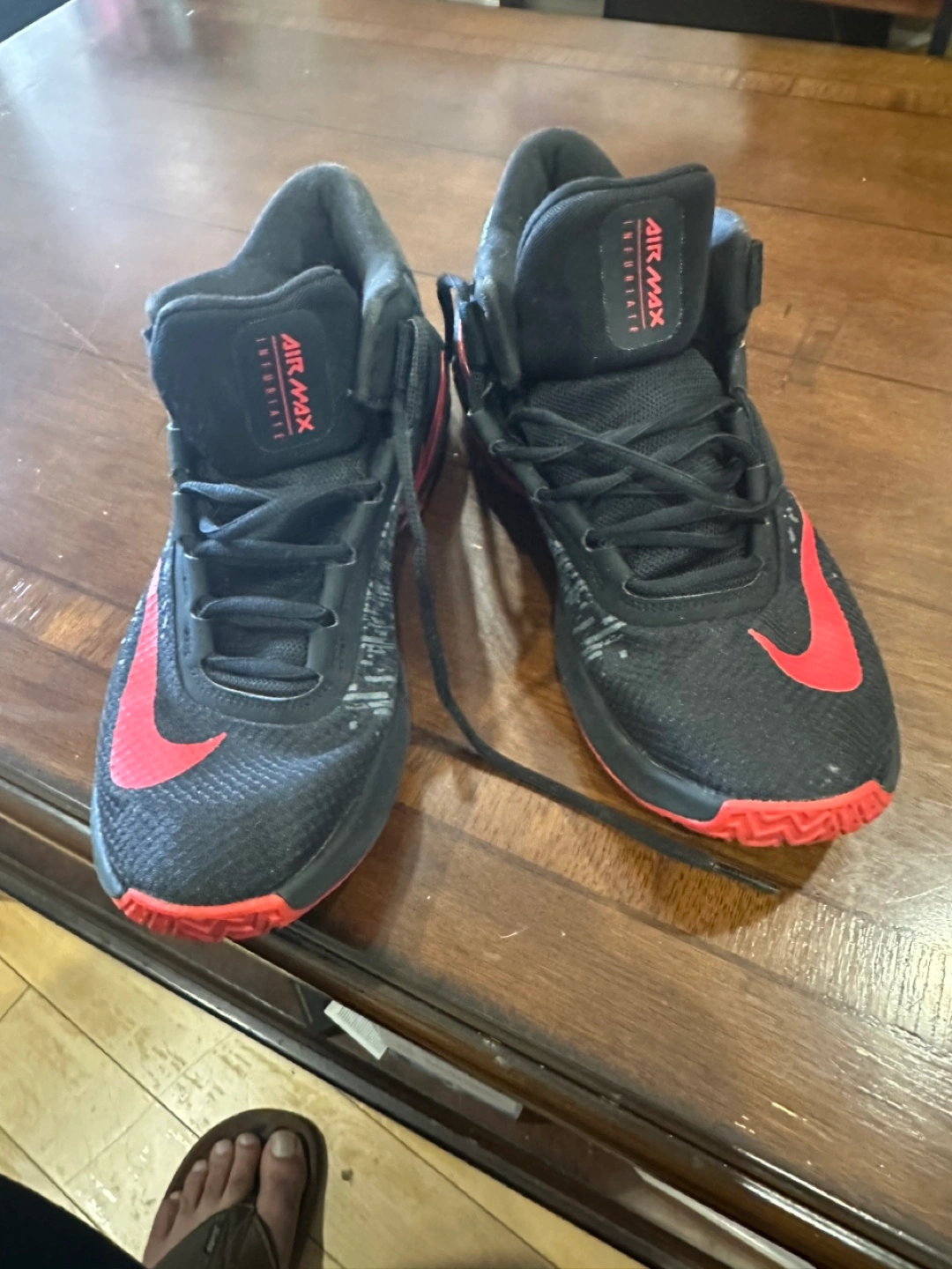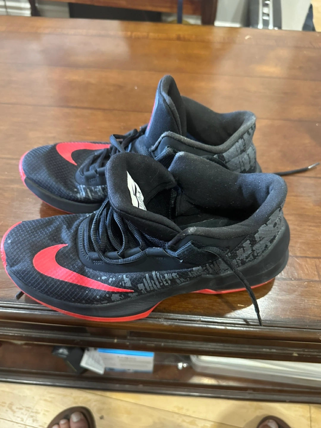 Pre-owned Nike Air Max Effort basketball shoes. Black with red accents. Good condition, some wear. Men's size 7.5.