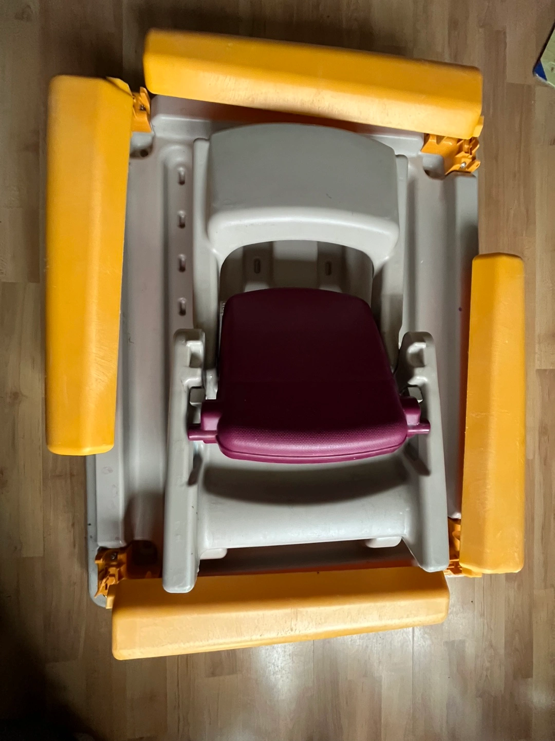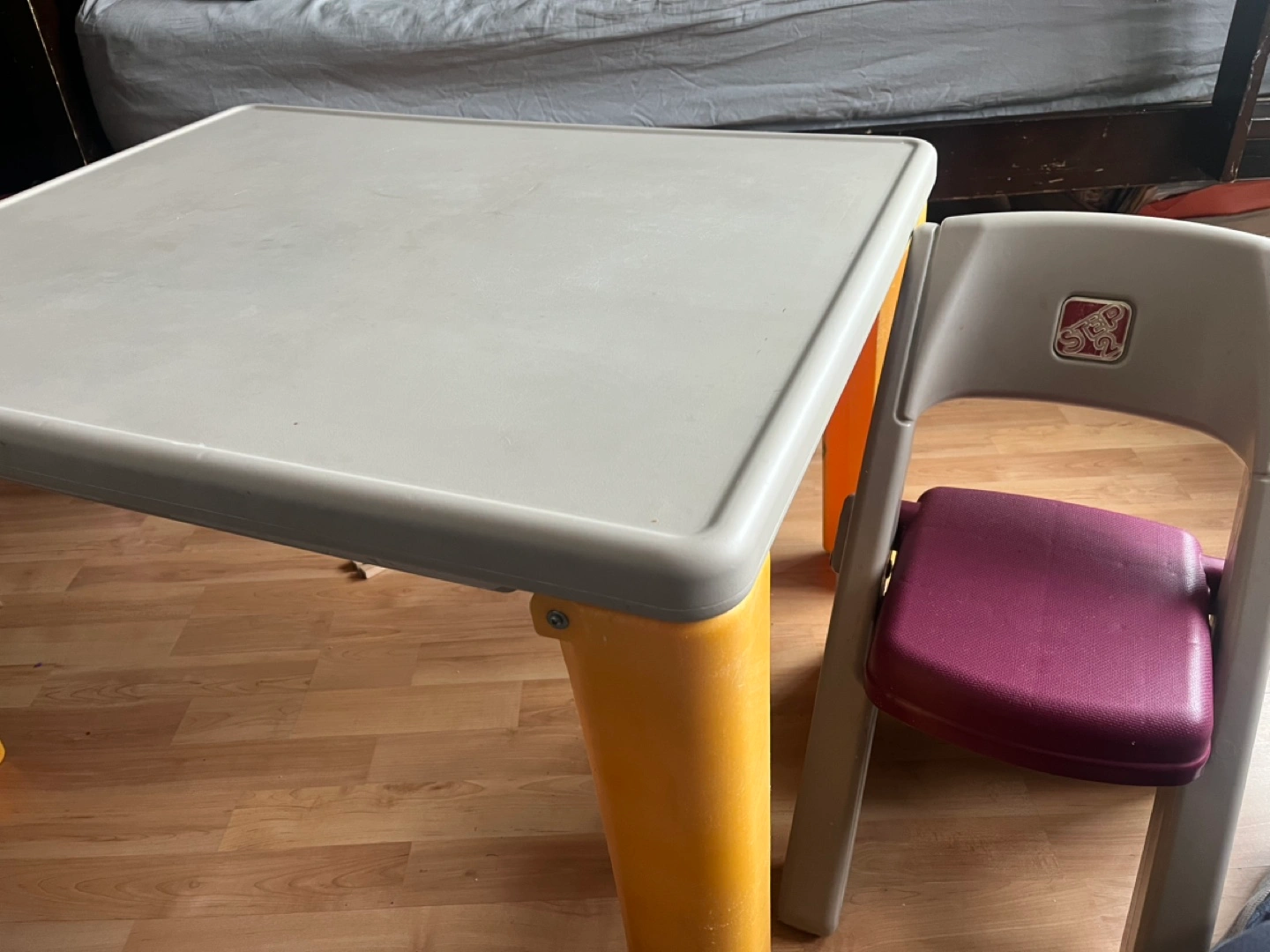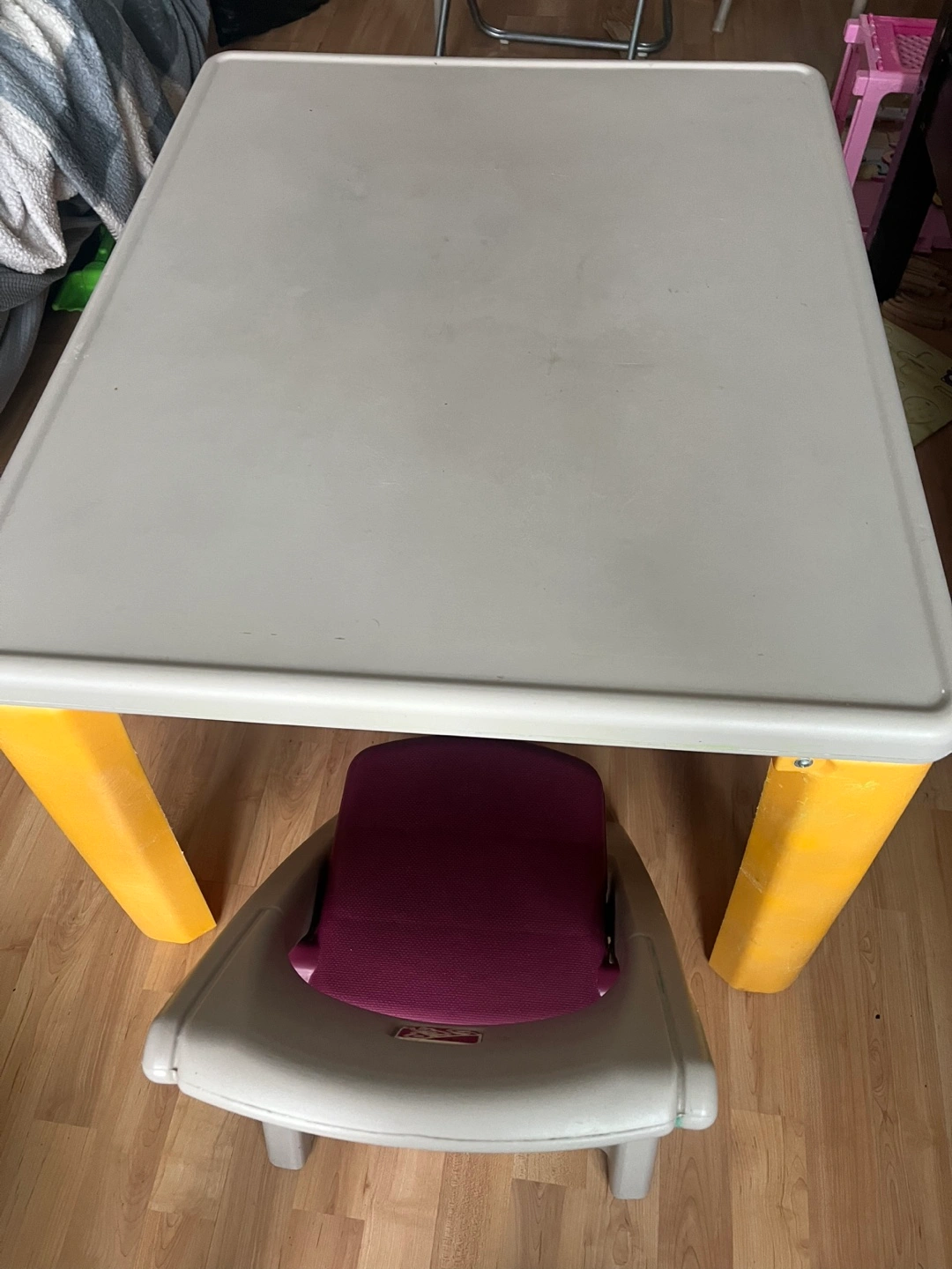 Foldable Kids' table and chair set. Grey and yellow table, purple chair. Plastic construction. Suitable for toddlers and preschoolers. Pet free, smoke free home