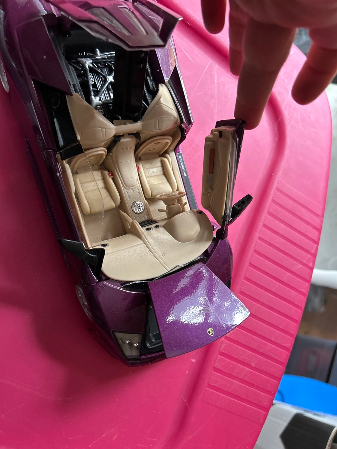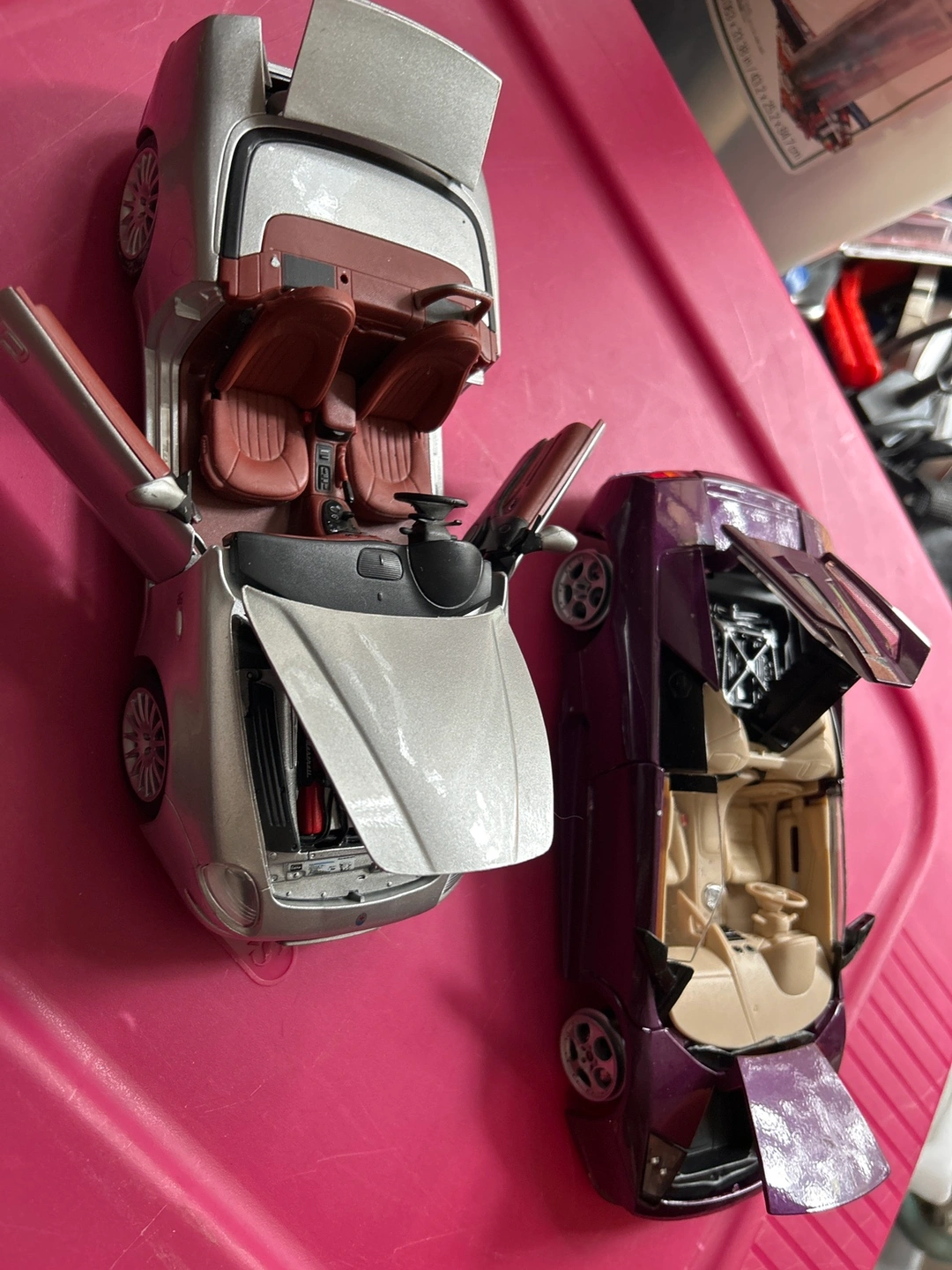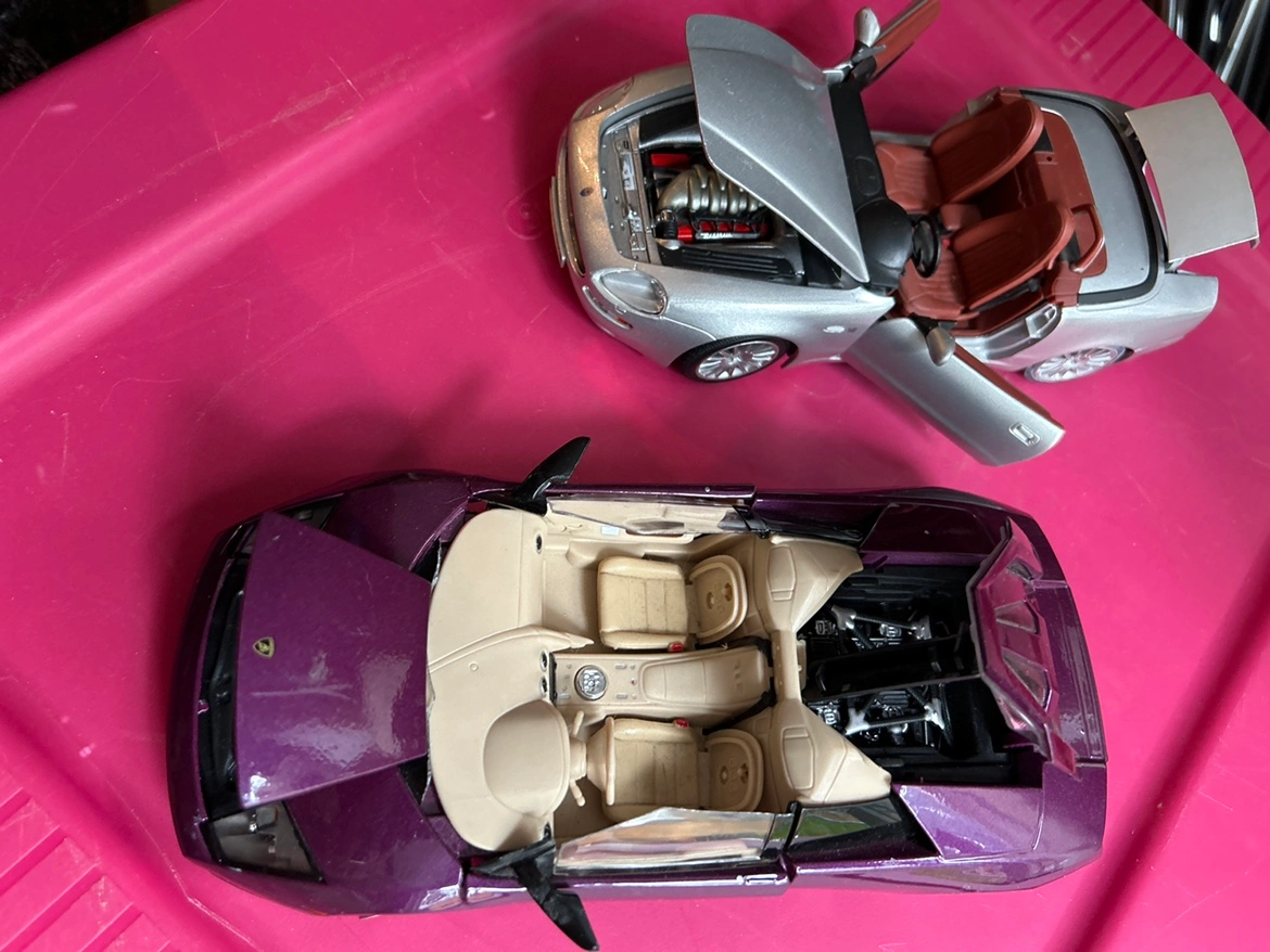 Two collectible diecast model cars. Purple Lamborghini Murciélago Roadster and silver Maserati Spyder. Detailed interiors and opening parts. Great for collectors or enthusiasts.