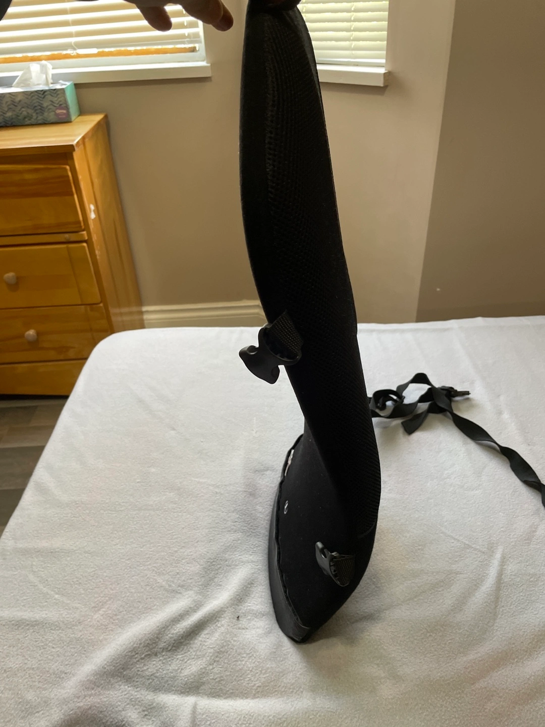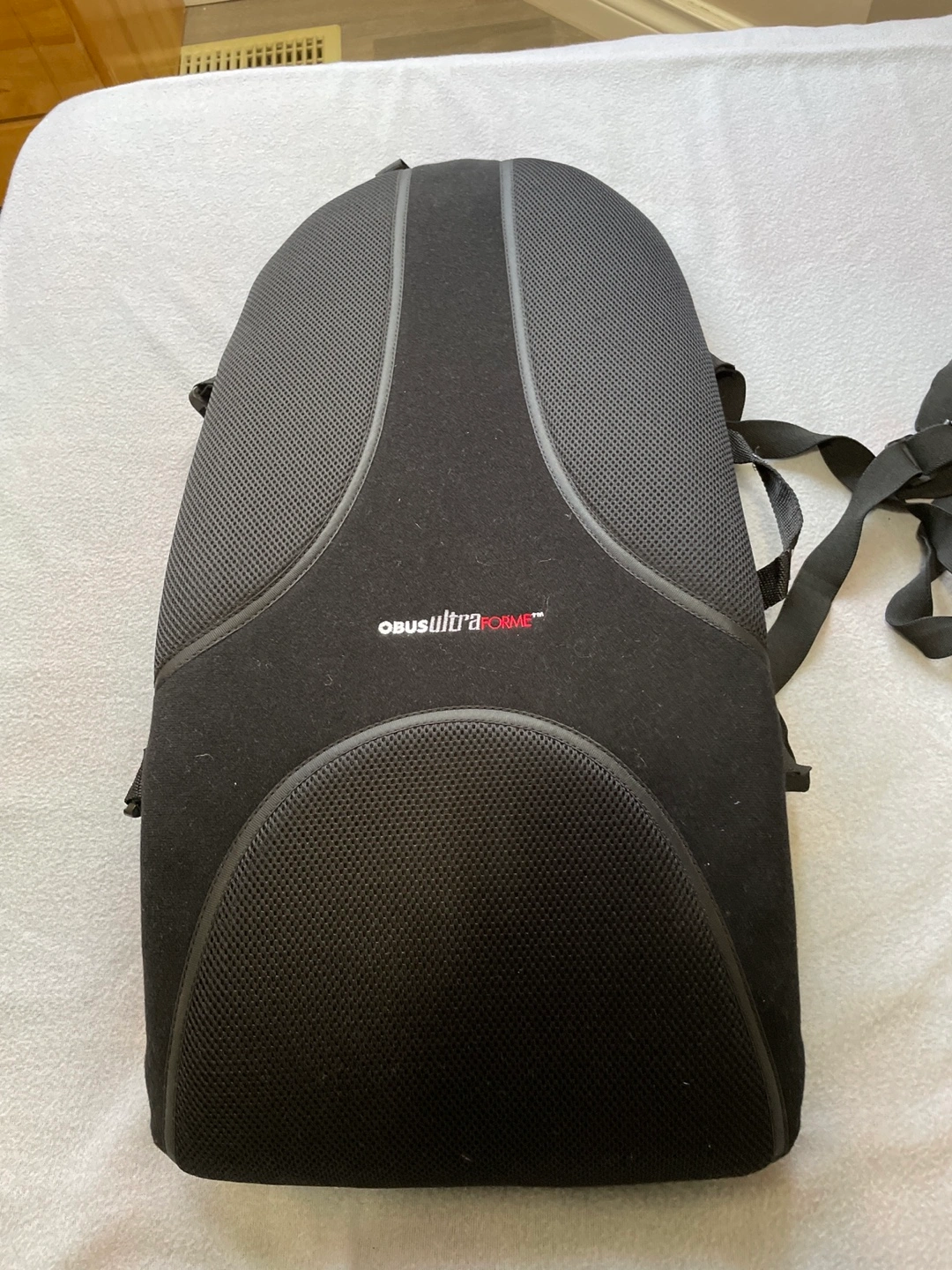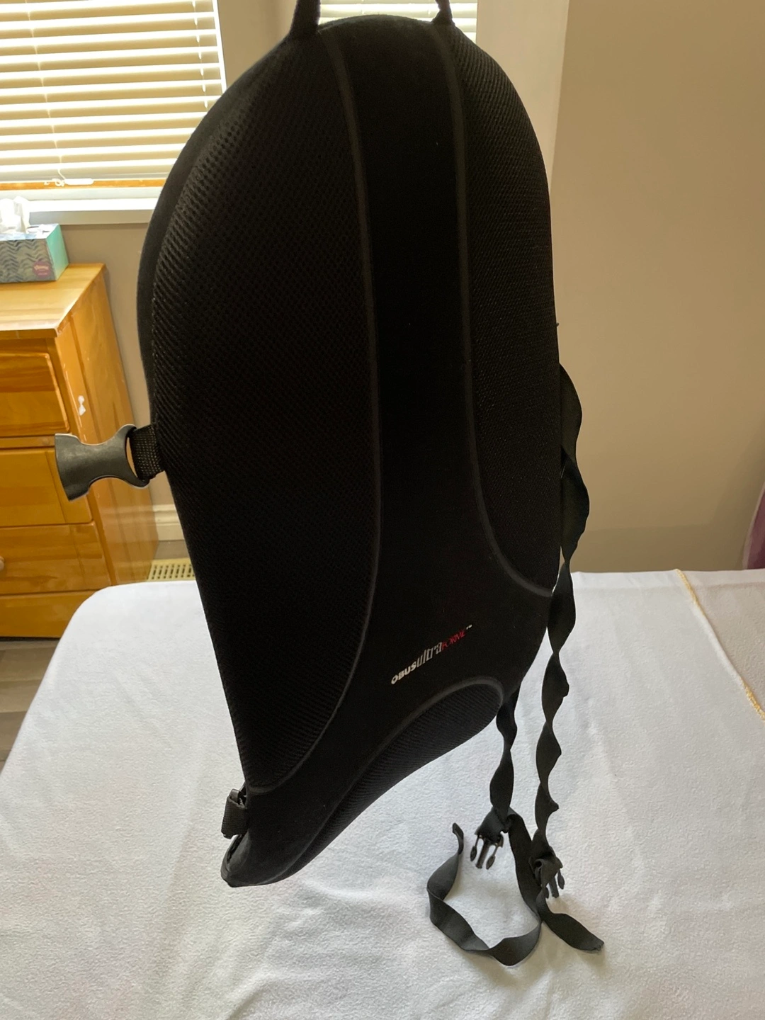 Black lumbar support. Features adjustable straps. Size large. Good for back support.