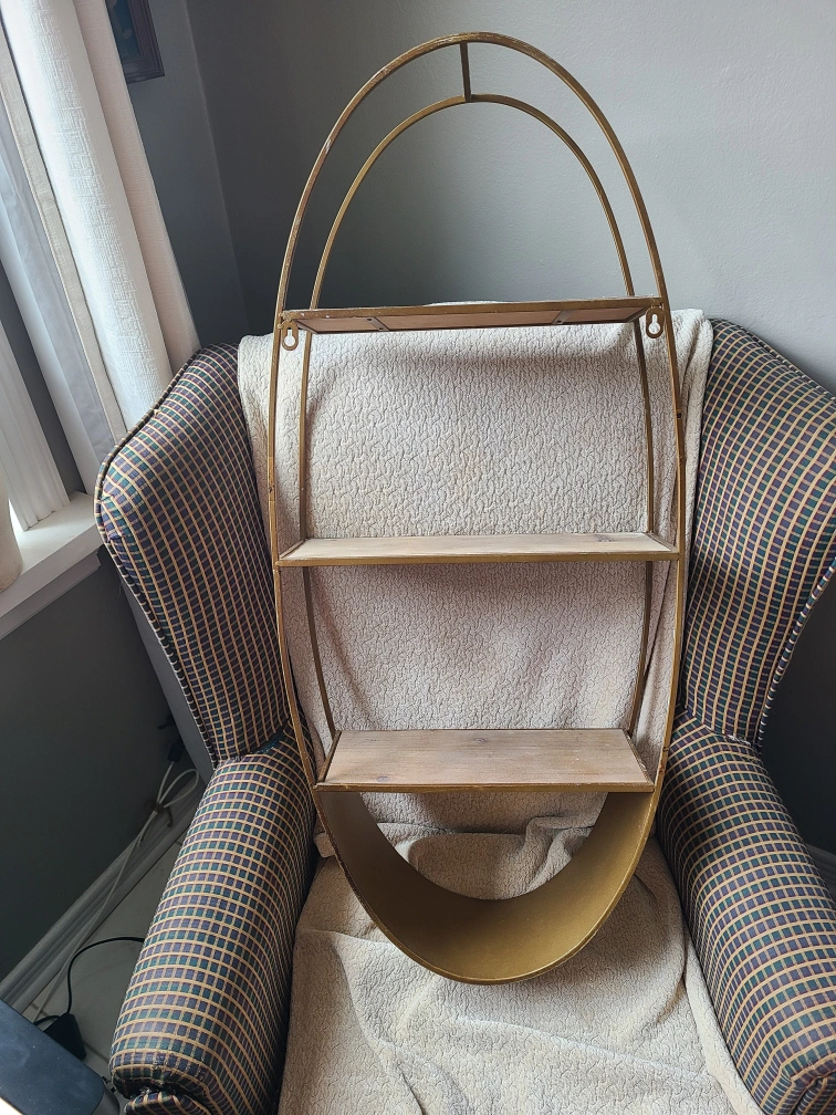 Oval-shaped wall shelf. Three wooden shelves. Gold metal frame. Perfect for displaying small items. Minimalist design.