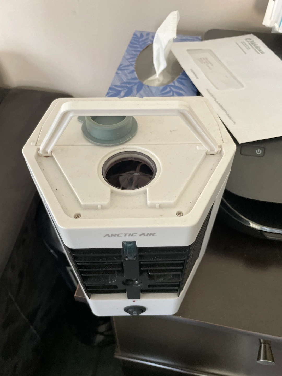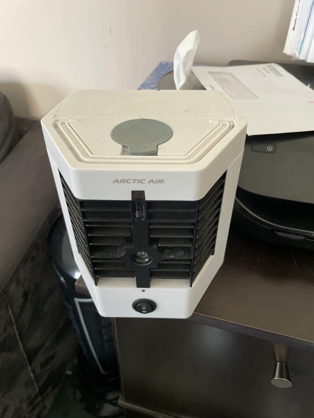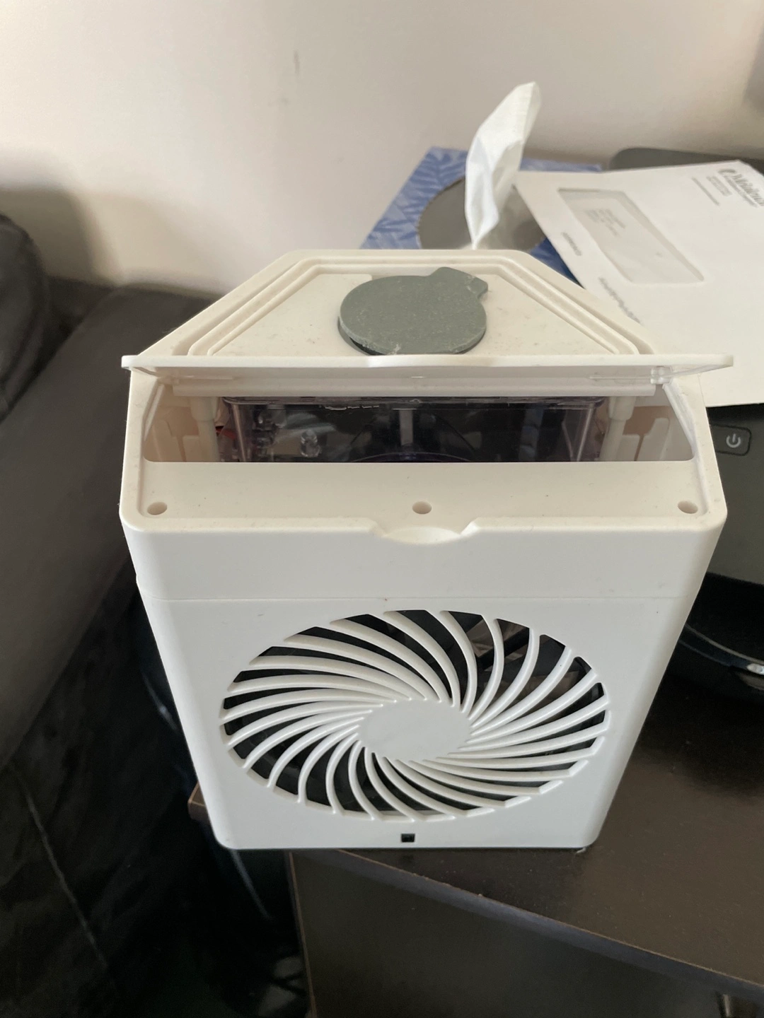 Portable personal cooler. Small and compact. White plastic. Features a fan and water reservoir. Used condition.