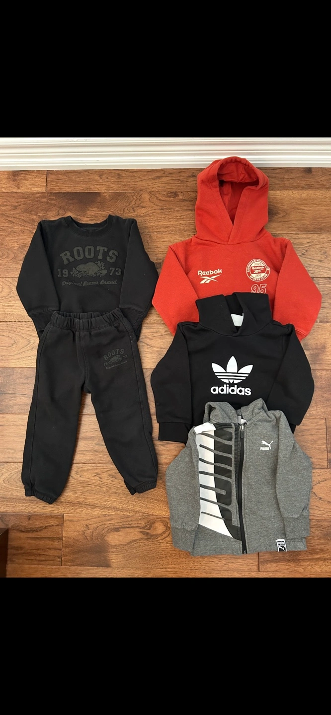 Large bundle of boy clothes. Includes hoodies, sweatpants, t-shirt, shorts, winter jacket Brands include Roots, Adidas, Reebok, Puma, and Nike. Some shoes included. Size 2- clothes Shoes size 5 Price is for everything