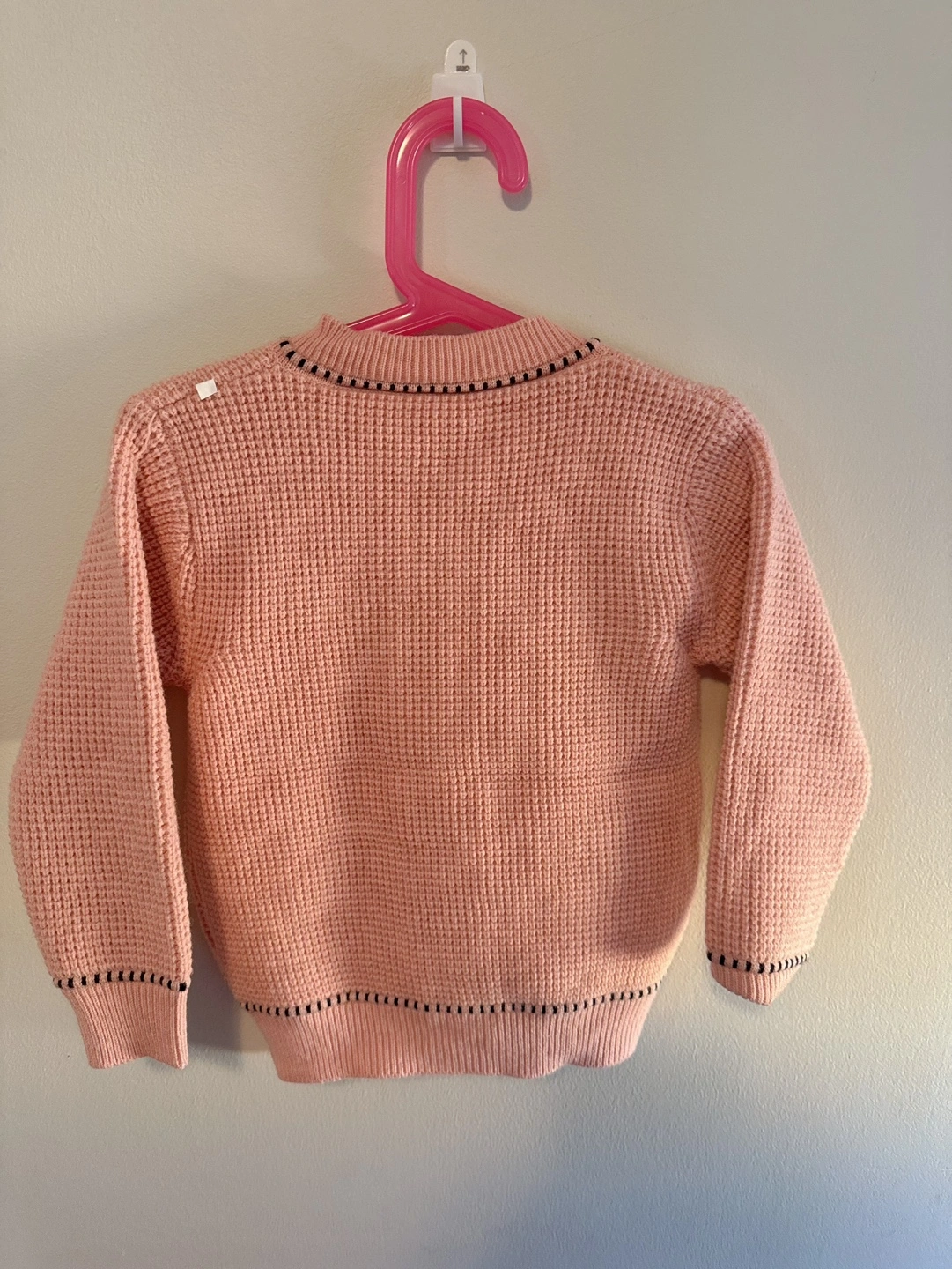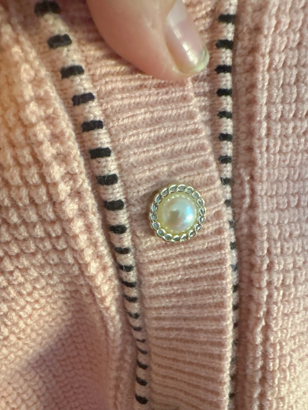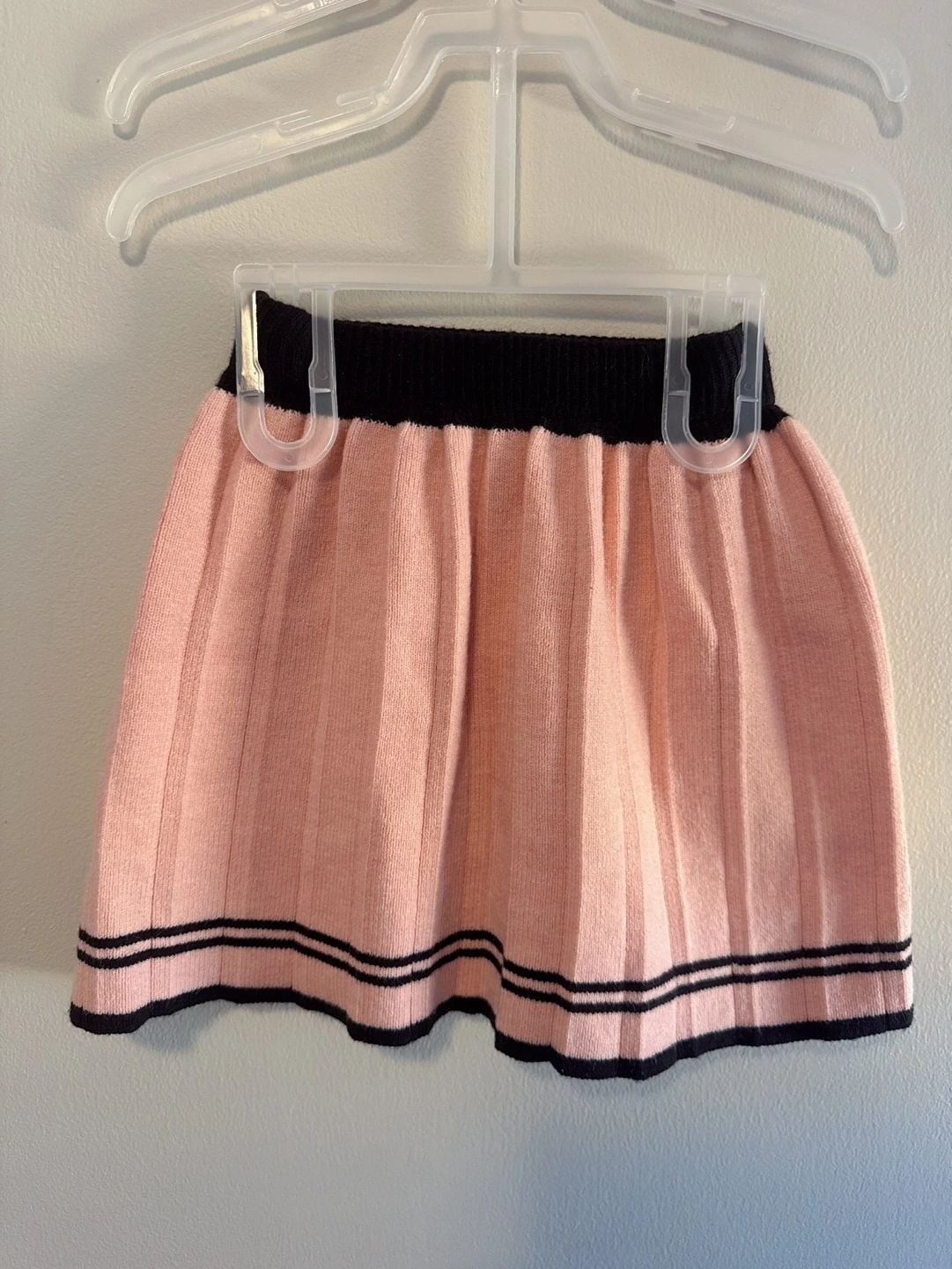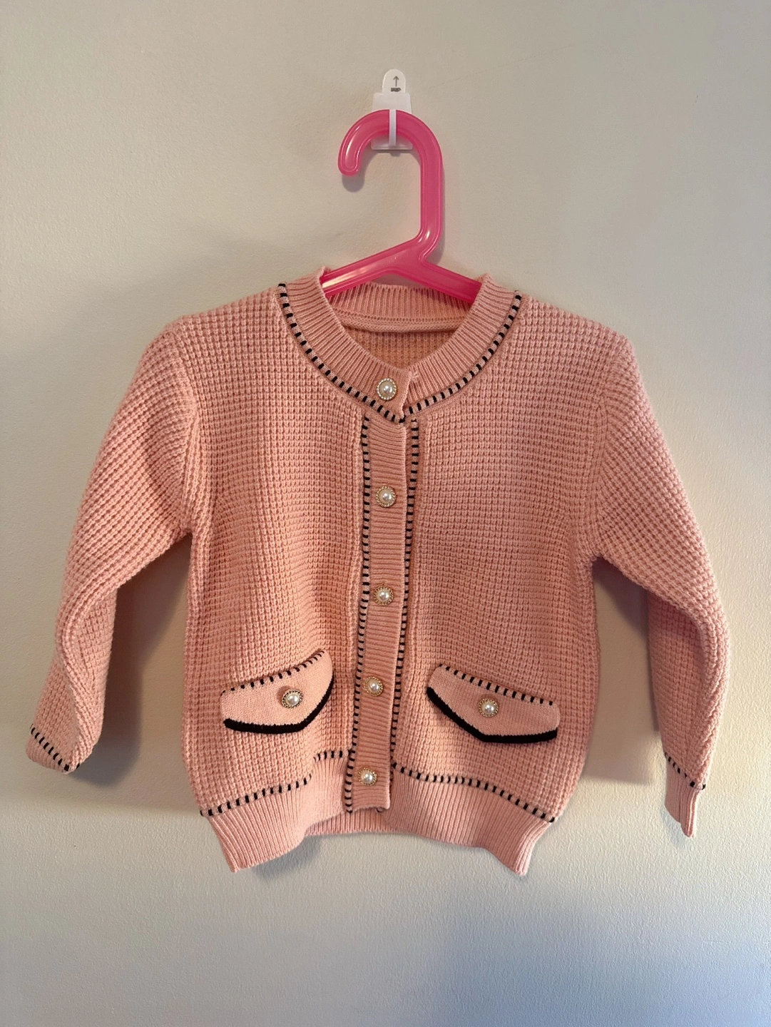 Lovely baby girl's outfit. Features a blush pink cardigan with pearl buttons and matching pleated skirt. Both pieces are soft knit material with black trim details. Perfect for a special occasion or everyday wear.