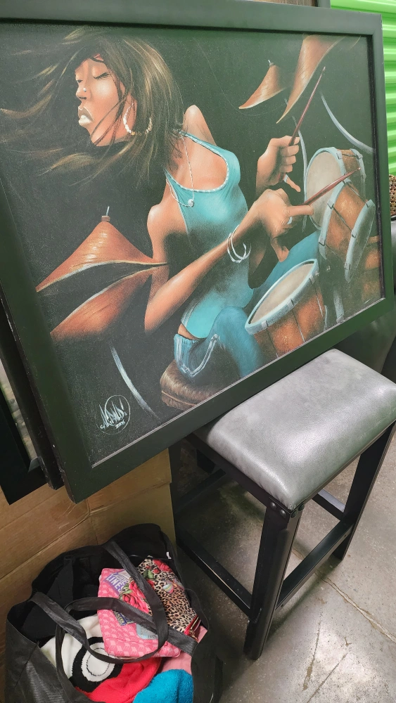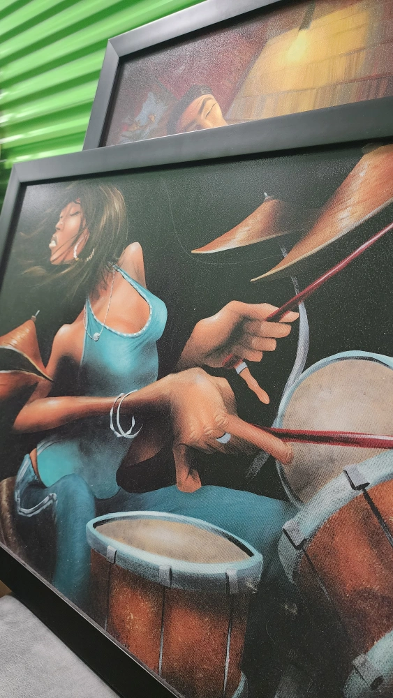 Large framed canvas print. Features a woman playing drums. Black frame. Good condition. Perfect for adding a stylish touch to your home décor.