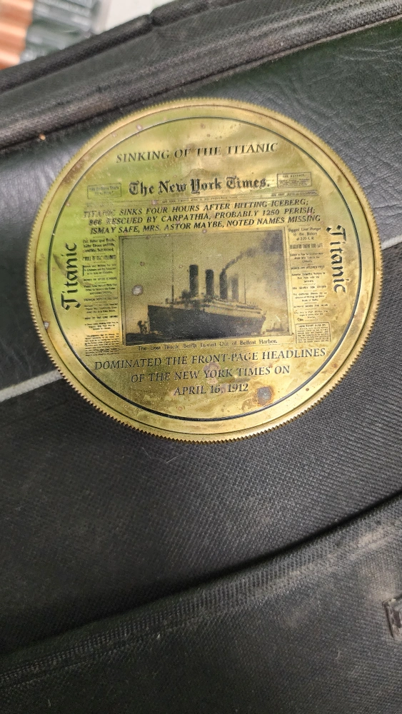 Brass compass featuring Titanic imagery. One side shows a newspaper clipping, the other a picture of the ship. Collectible item.