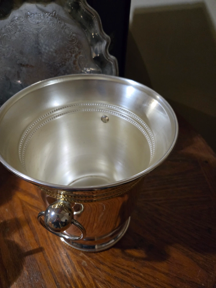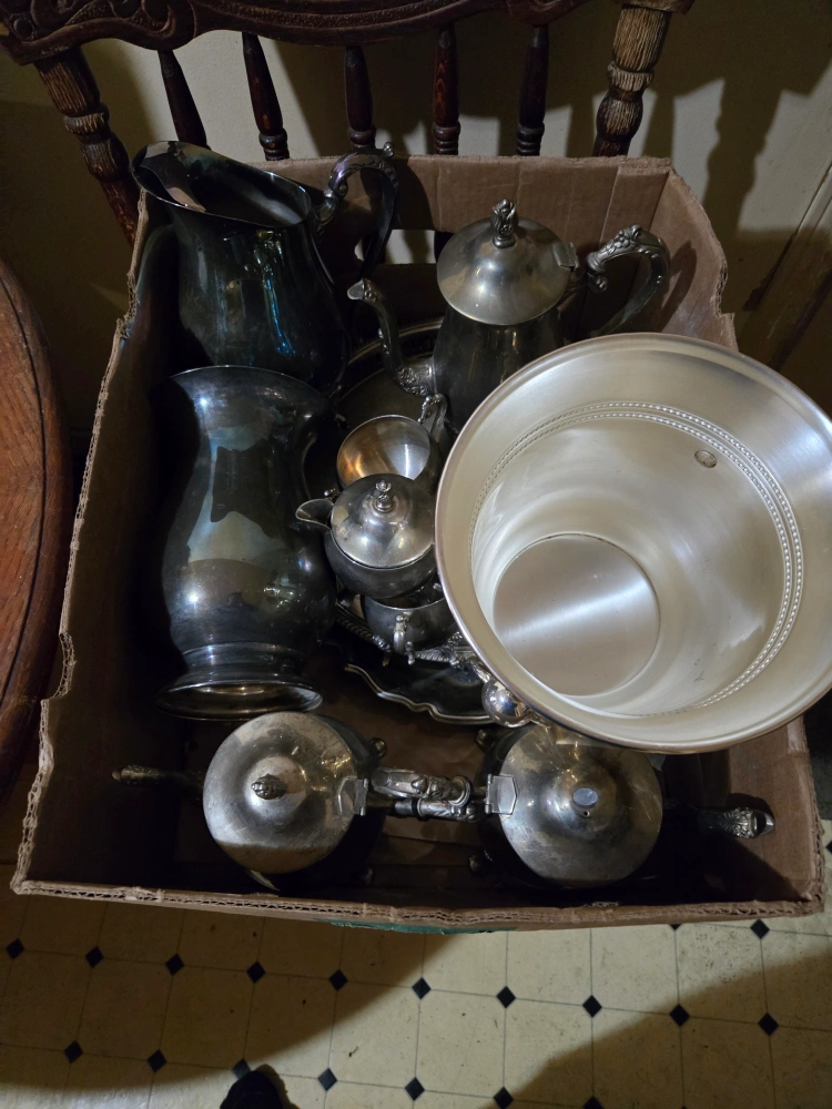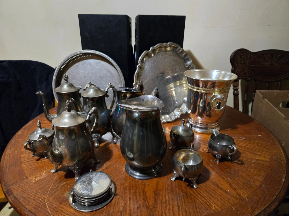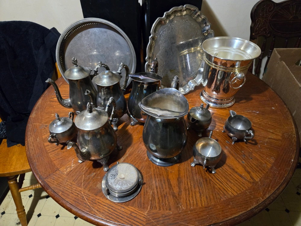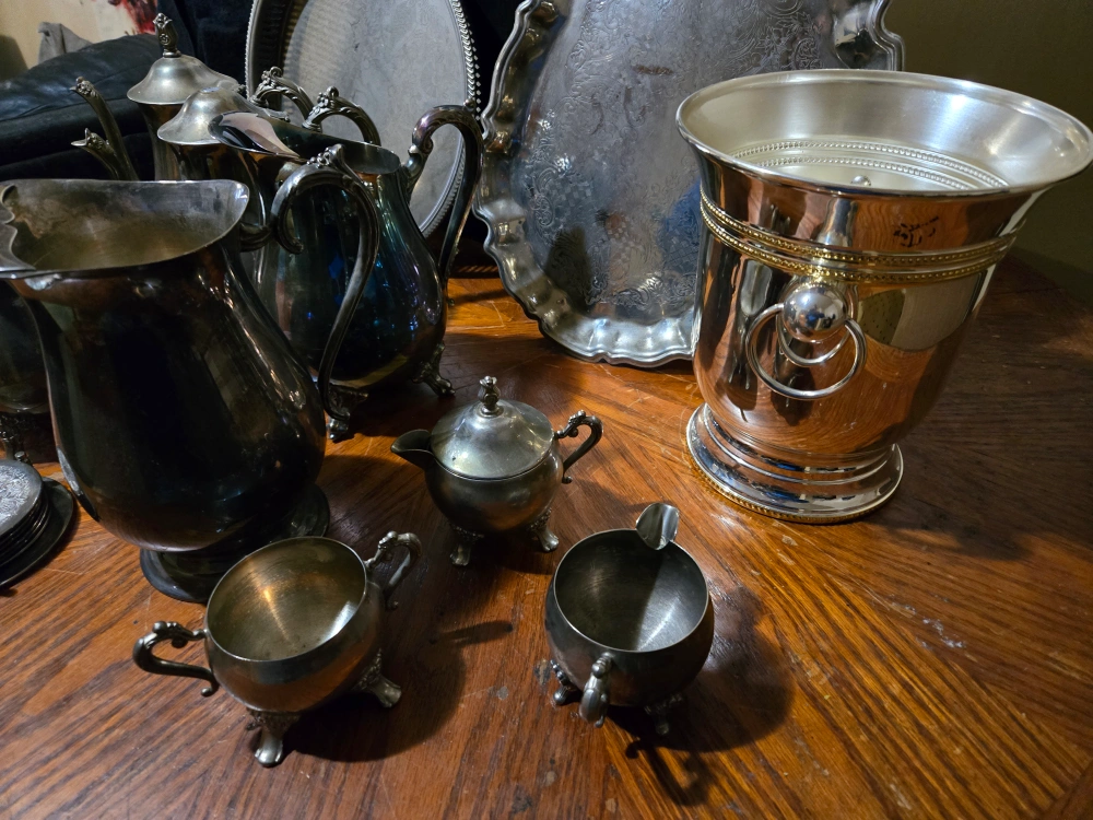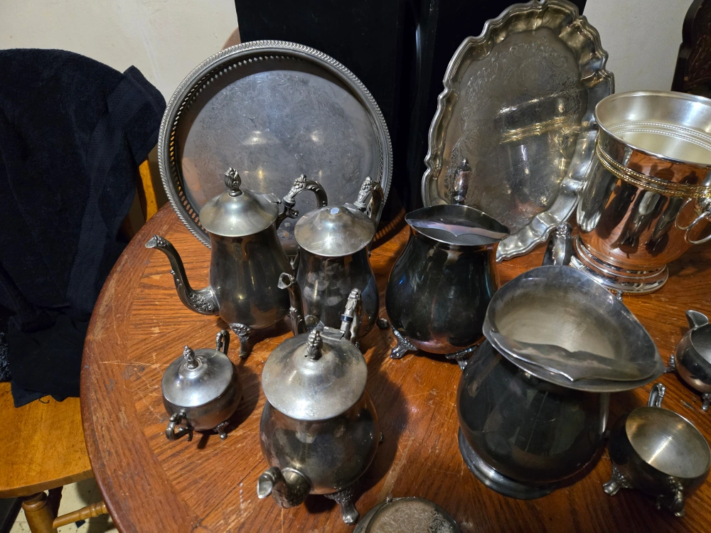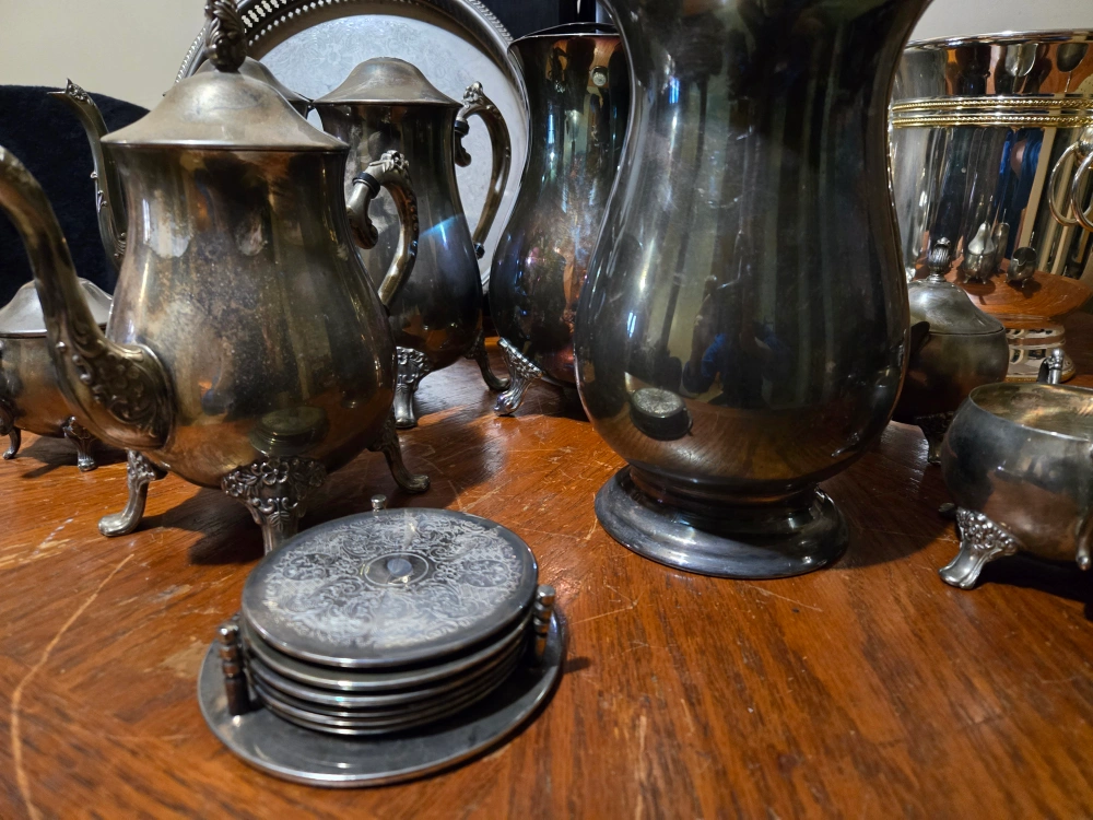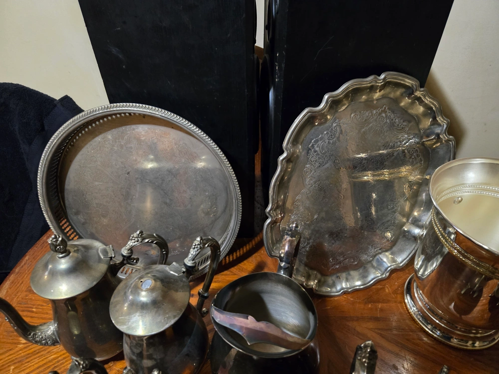 Collection of vintage silver-plated serving pieces. Includes teapots, creamer, sugar bowl, ice bucket, and two serving trays. Beautiful ornate detailing. Excellent for a collector or for adding a touch of vintage elegance to your home.