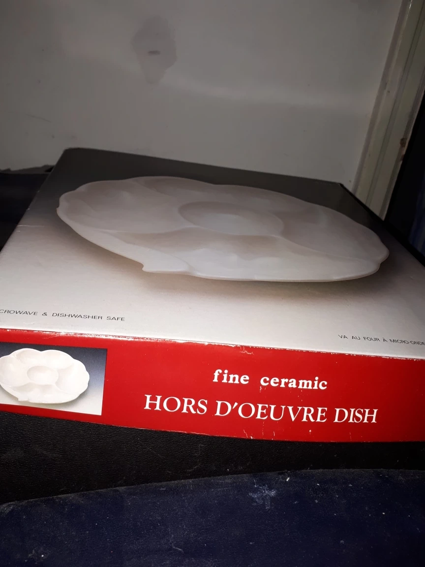 Microwave and dishwasher safe. New in box. White ceramic dish with multiple compartments. Perfect for serving appetizers or snacks.