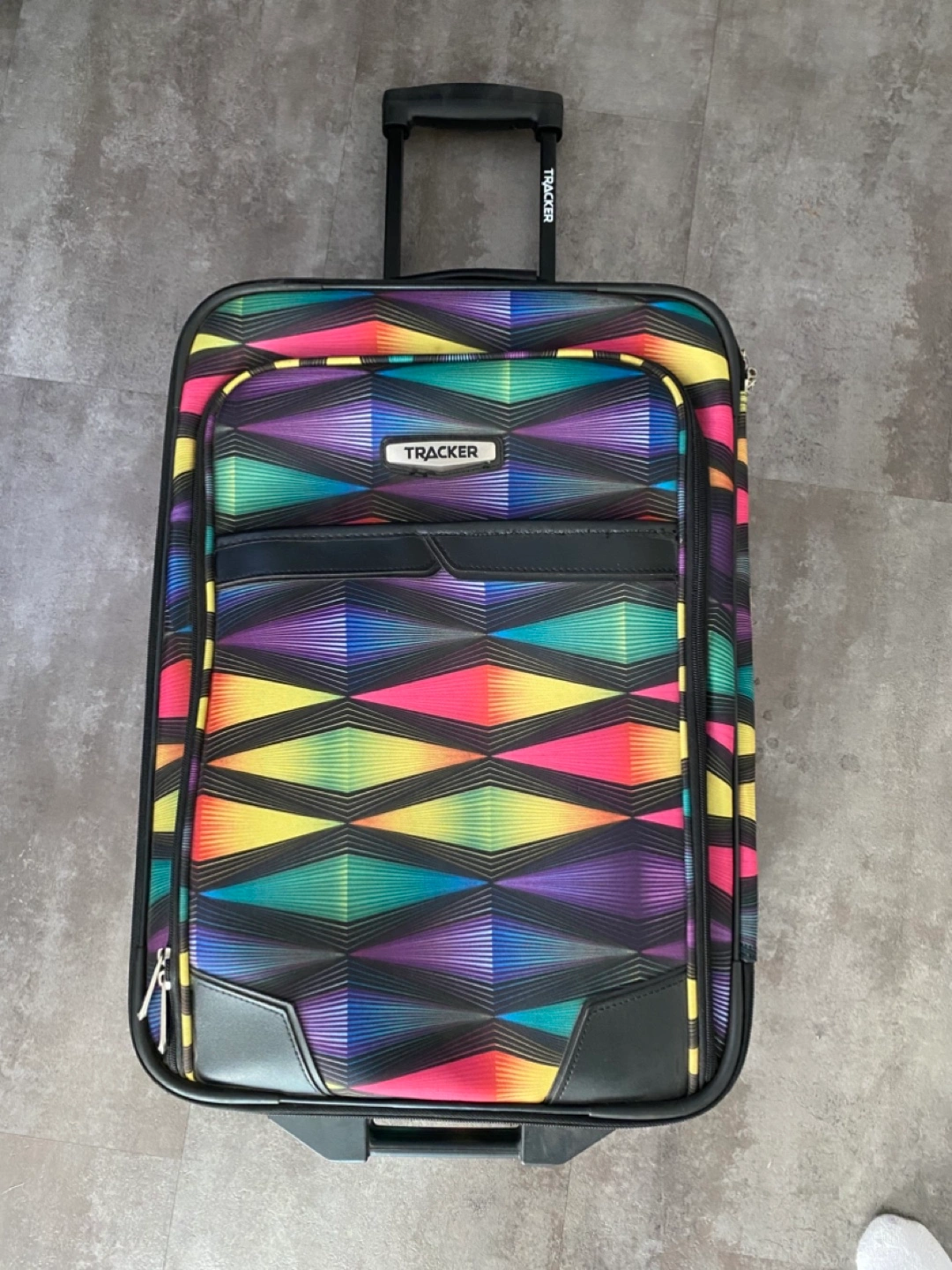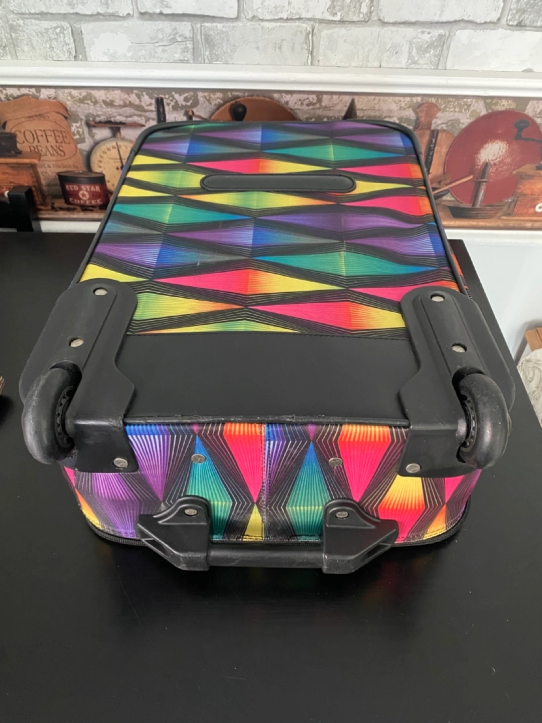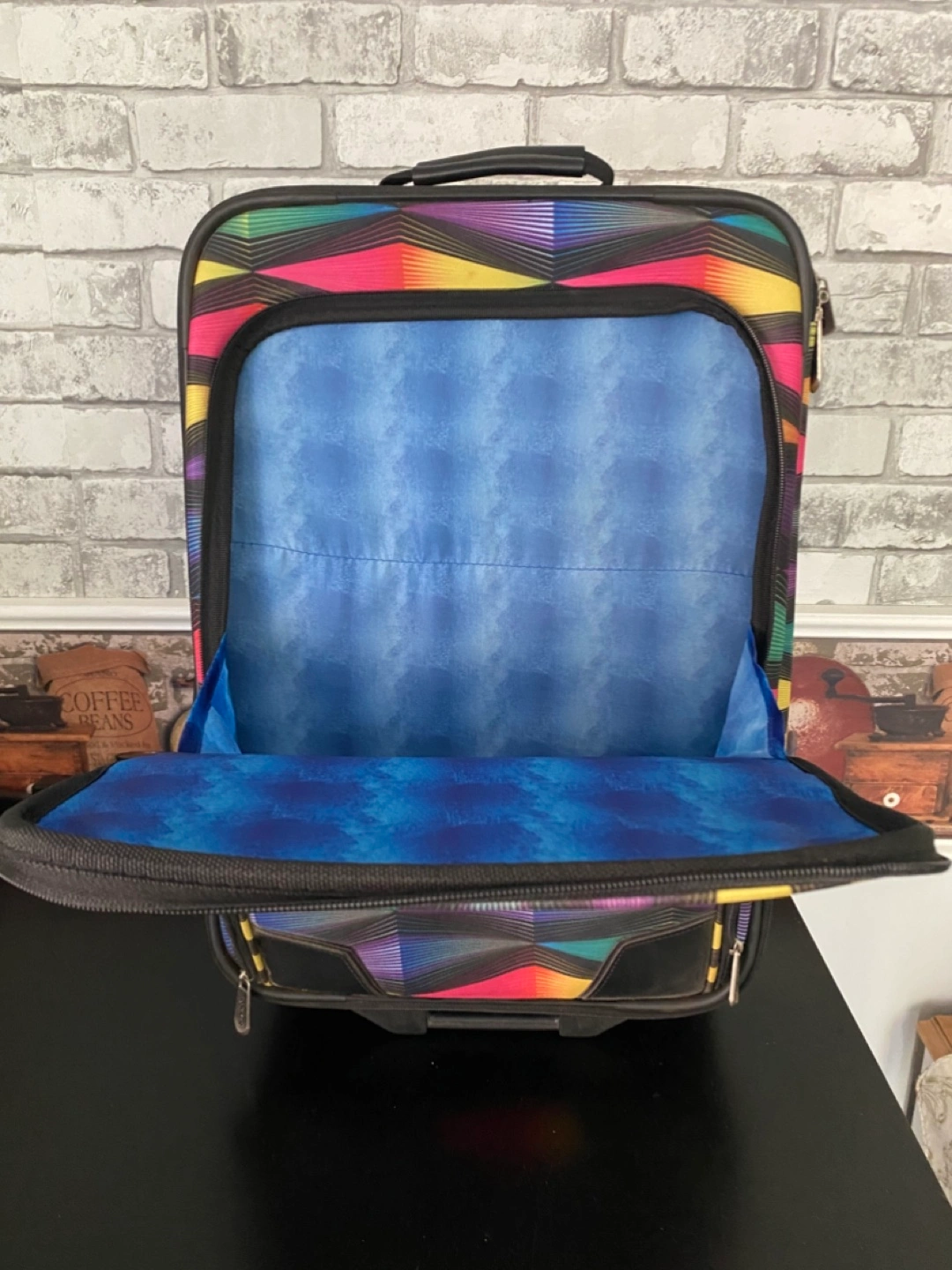 Carry-on suitcase. 2 wheels. Retractable push button locking handle. Colorful multi colour geometric design. Interior features zippered pockets and compression straps. Excellent Condition! No issues, everything works. Durable fabric material. Measures 21” in height, 15” wide, 7” depth. Sturdy shell. Used once. Cash and pick up only, Cawthra and Lakeshore area in Mississauga.