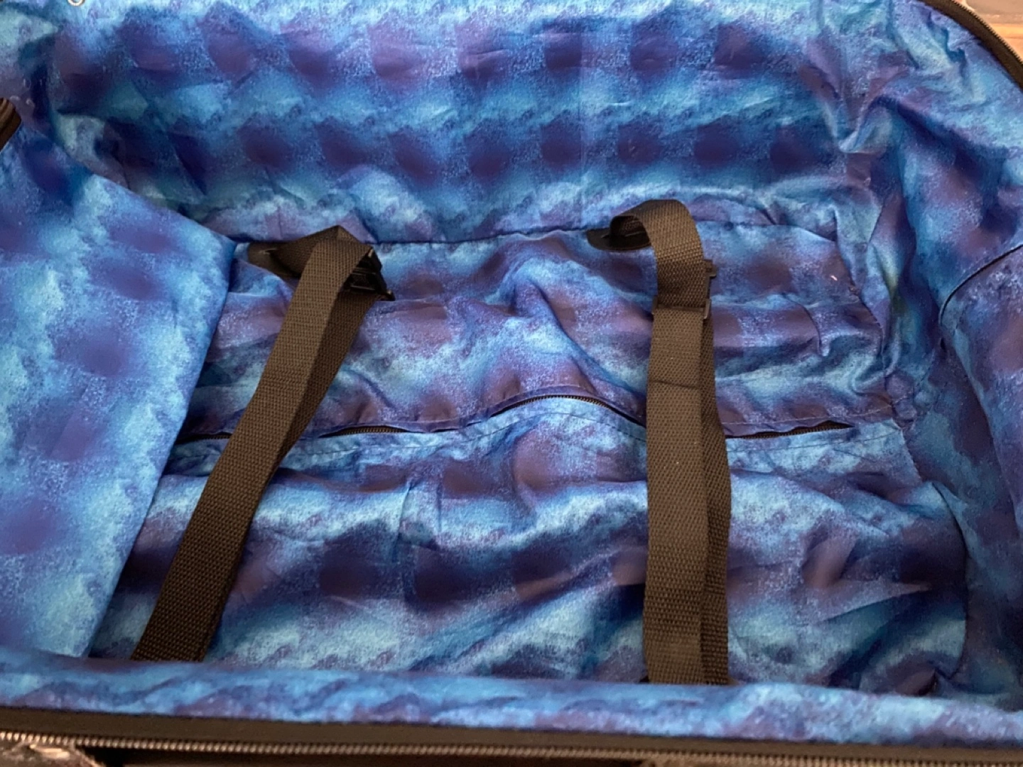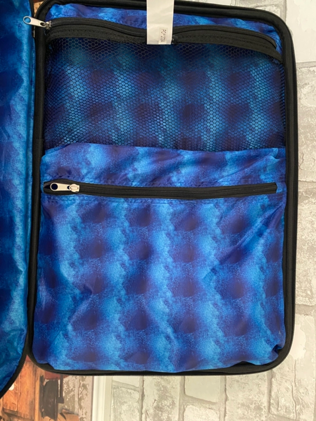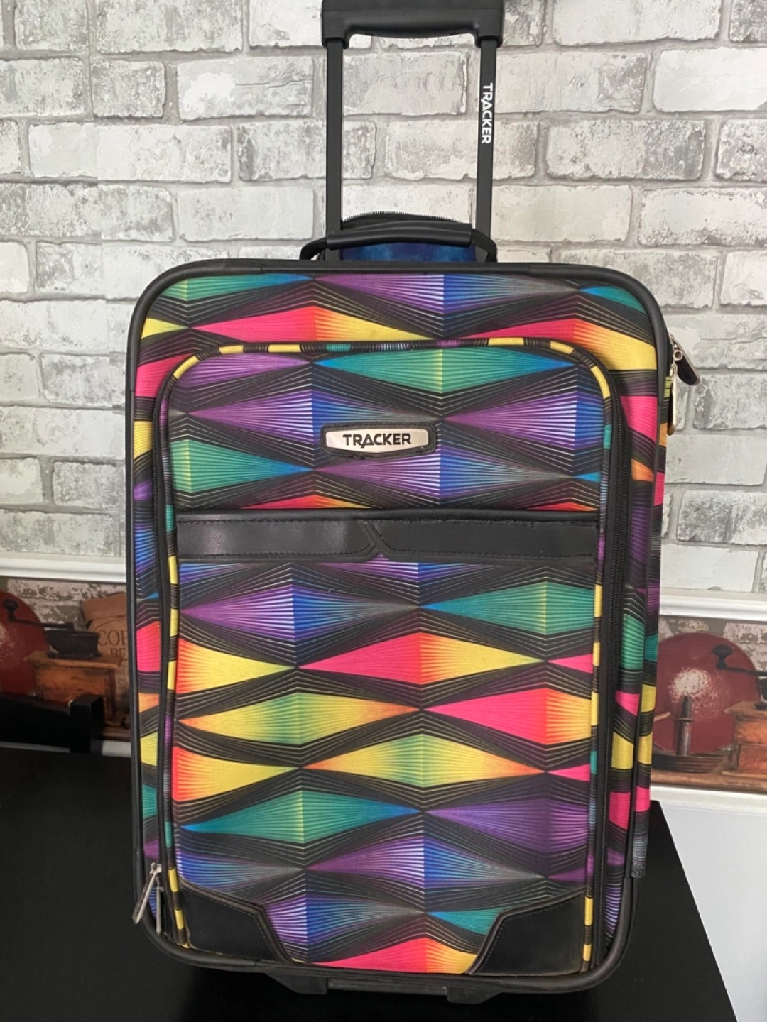 Carry-on suitcase. 2 wheels. Retractable push button locking handle. Colorful multi colour geometric design. Interior features zippered pockets and compression straps. Excellent Condition! No issues, everything works. Durable fabric material. Measures 21” in height, 15” wide, 7” depth. Sturdy shell. Used once. Cash and pick up only, Cawthra and Lakeshore area in Mississauga.