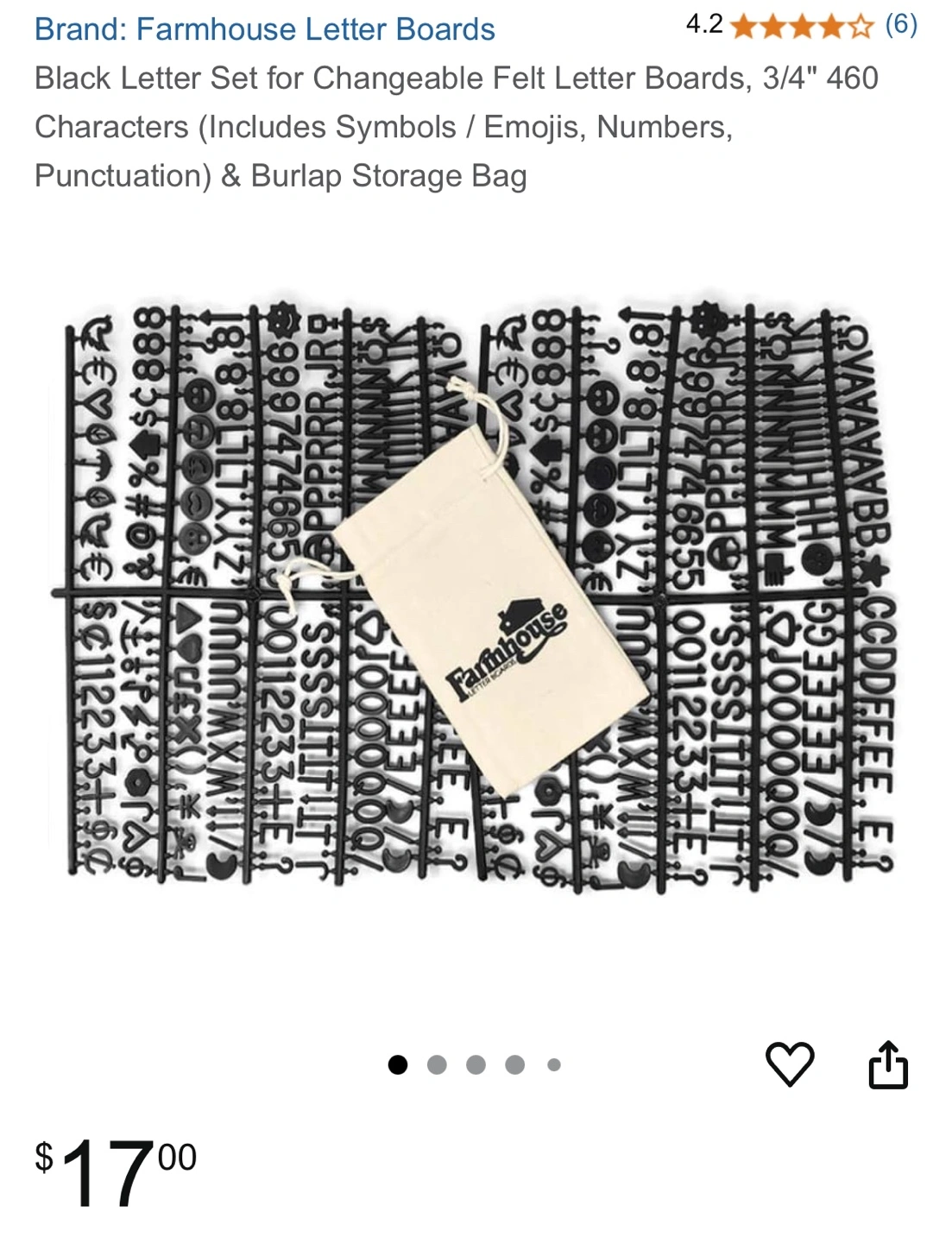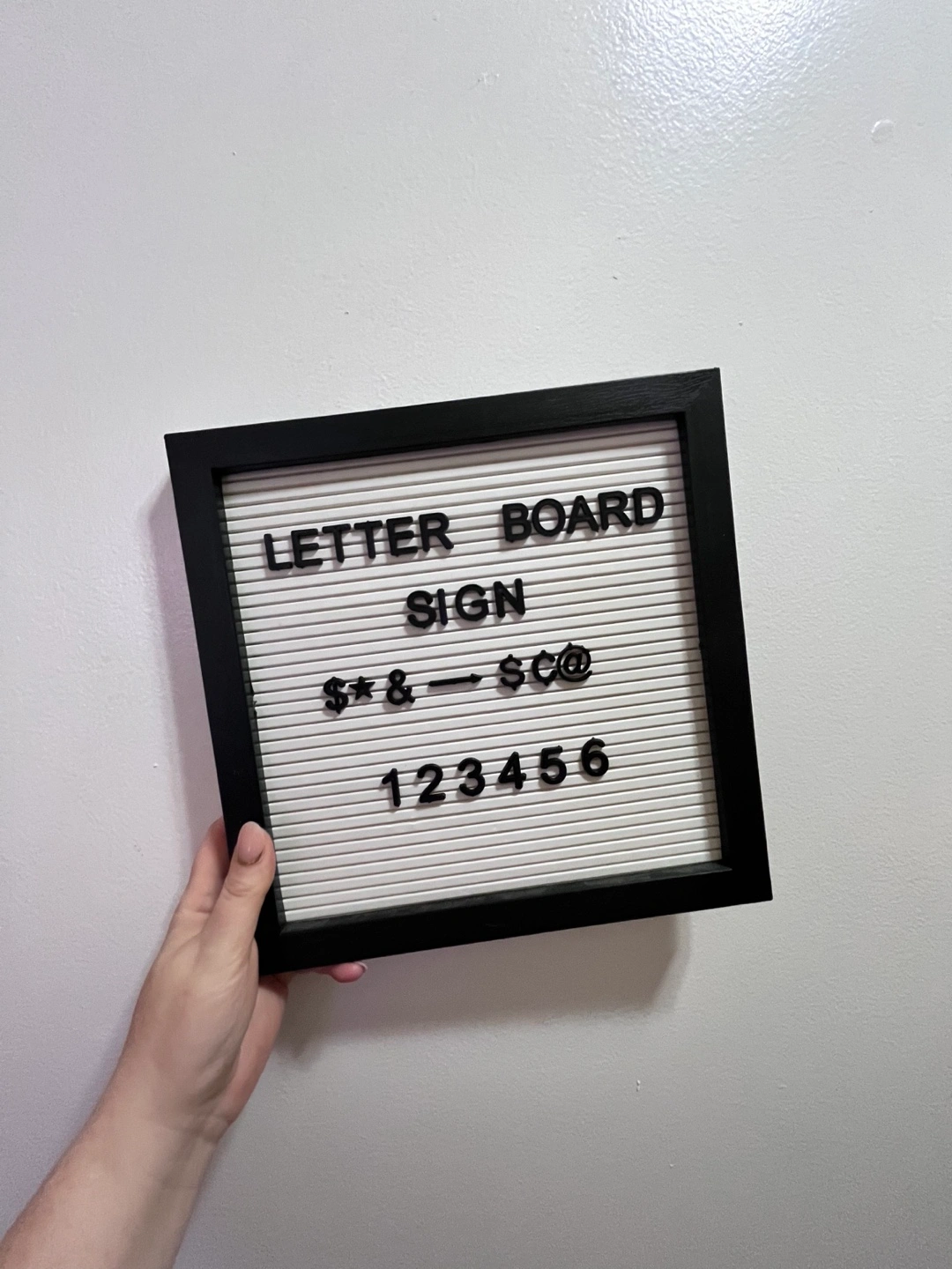 Used 10x10in letter board (8.5x8.5 inner board area). Comes with a standard set of alphabet, numbers, and some special characters. There are 2-3 each of the letters and numbers. ALSO comes with an extra unopened set of 460 characters including emojis (retails for almost $20 on Amazon). Some markings on the board but not very noticeable with the letters on it. Ready to hang on the back or lean against something. Great for messages and decor! LOCATION: This item is for pickup at my home near King St West and Jameson Avenue in Parkdale (exact address is only given for confirmed pickups)