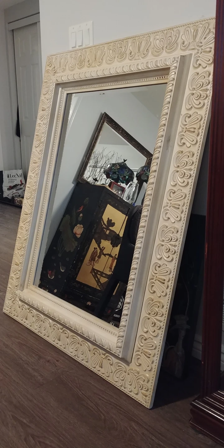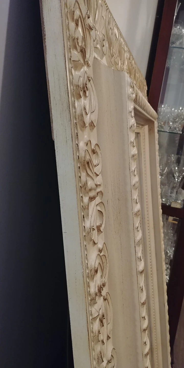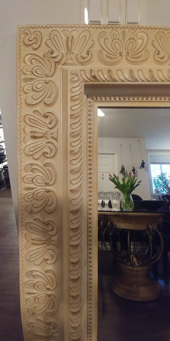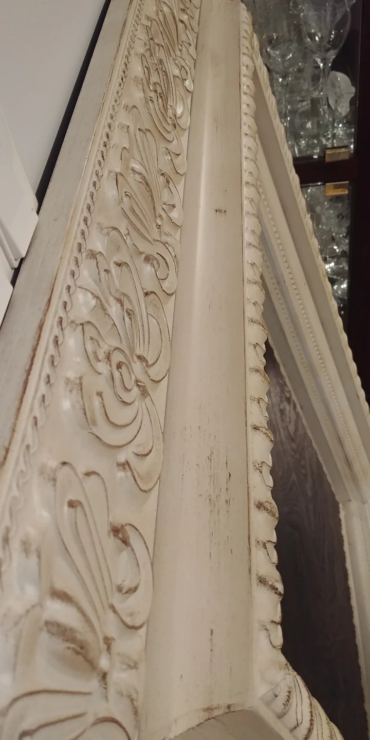 Large white washed carved wood distressed antique finish, beveled mirror, very heavy solid piece. Hardware on back to hang both horizontally or laterally. This mirror was originally $300 and has not been used. Too big for my new place, missed the return date so hopefully can go to a good home. It's beautiful. 51 inches x 39 inches