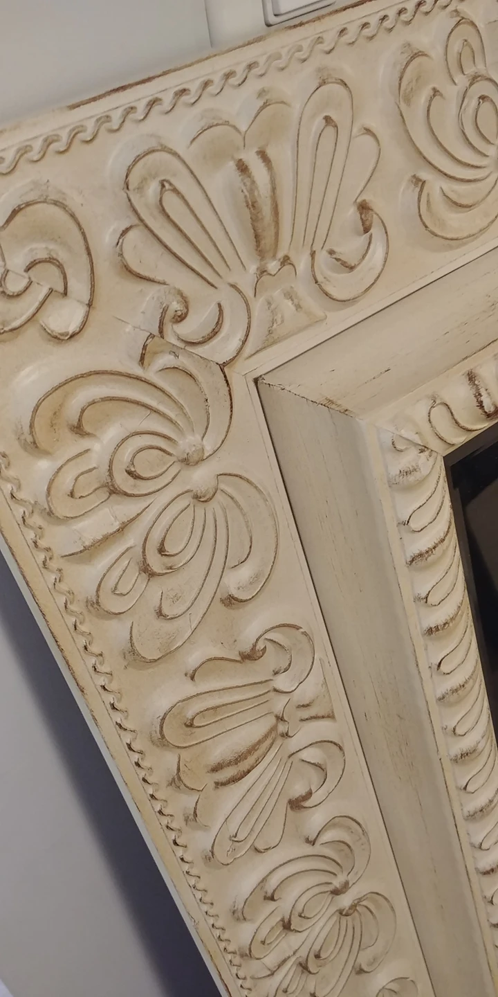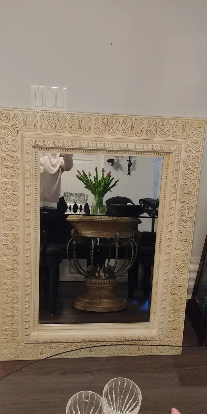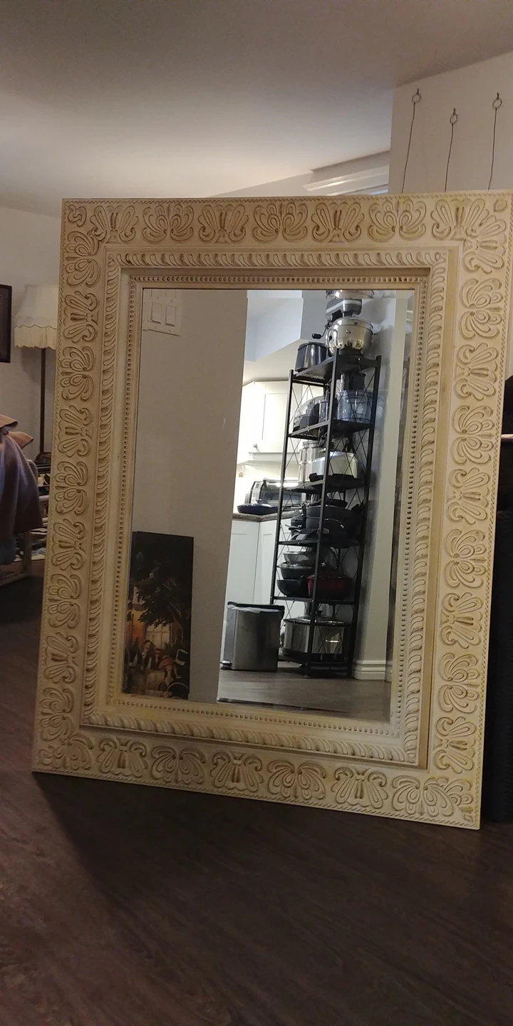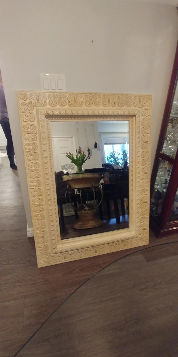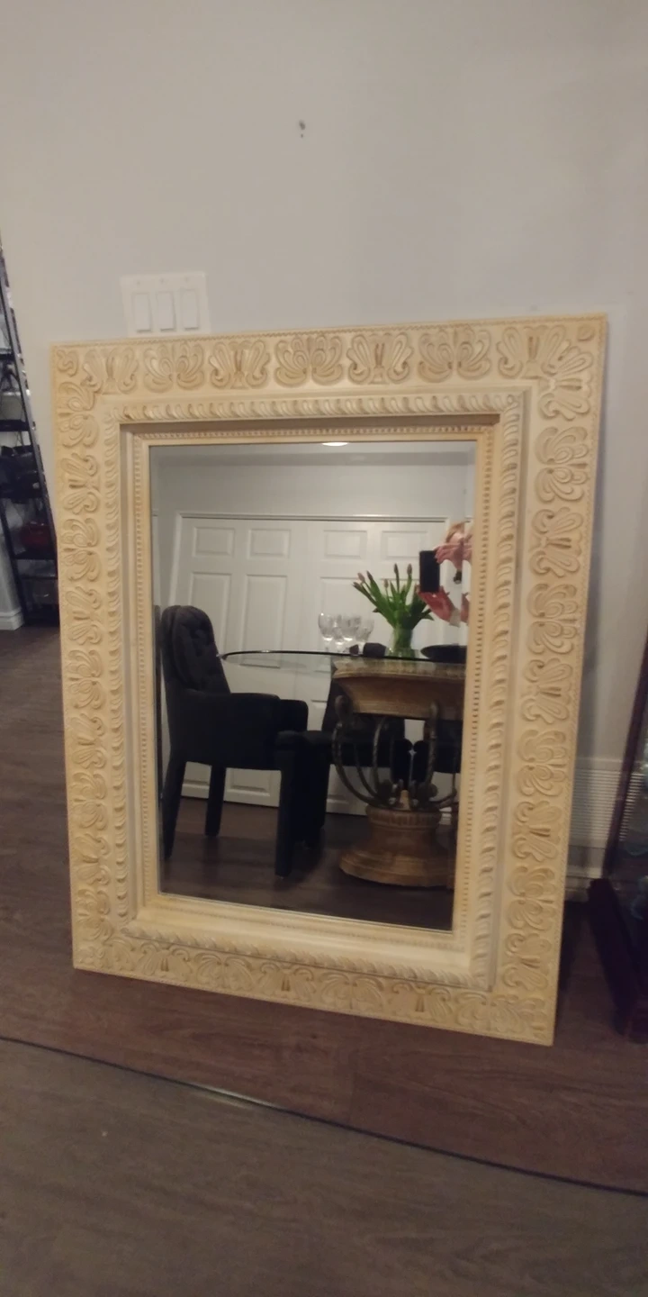 Large white washed carved wood distressed antique finish, beveled mirror, very heavy solid piece. Hardware on back to hang both horizontally or laterally. This mirror was originally $300 and has not been used. Too big for my new place, missed the return date so hopefully can go to a good home. It's beautiful. 51 inches x 39 inches