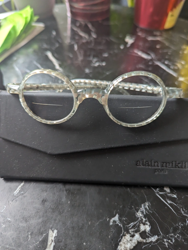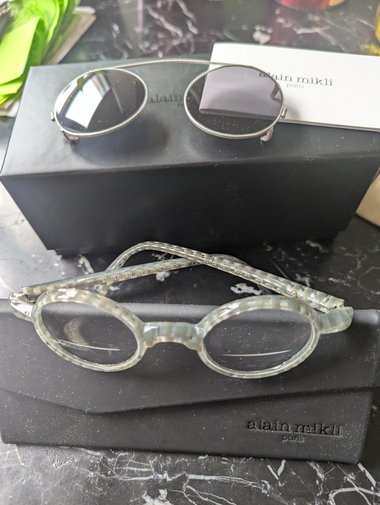 Beautiful Alain Mikli Frames, in shades of grey. The frame has prescription lenses that can be replaced. Also comes with clip on sunglasses that are non-prescription. Very minimal use. Original price in the $500. price range.