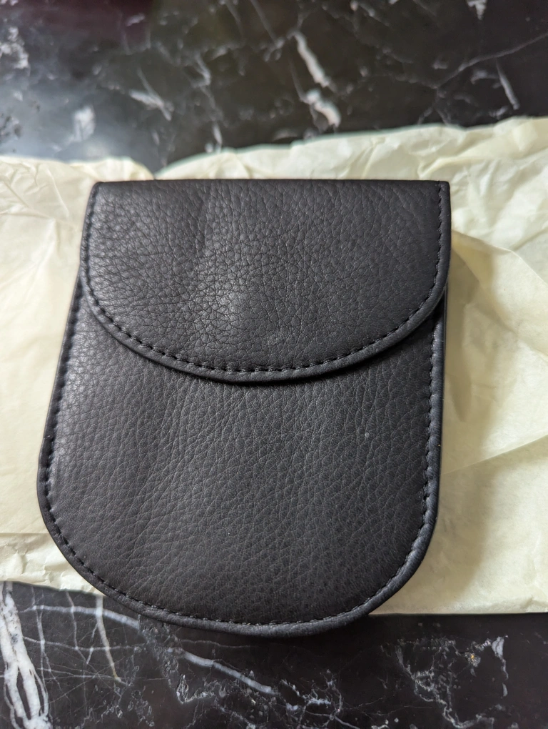 Black leather Osgood Marley billfold. Room for bills, coins and credit cards. Small and compact design.