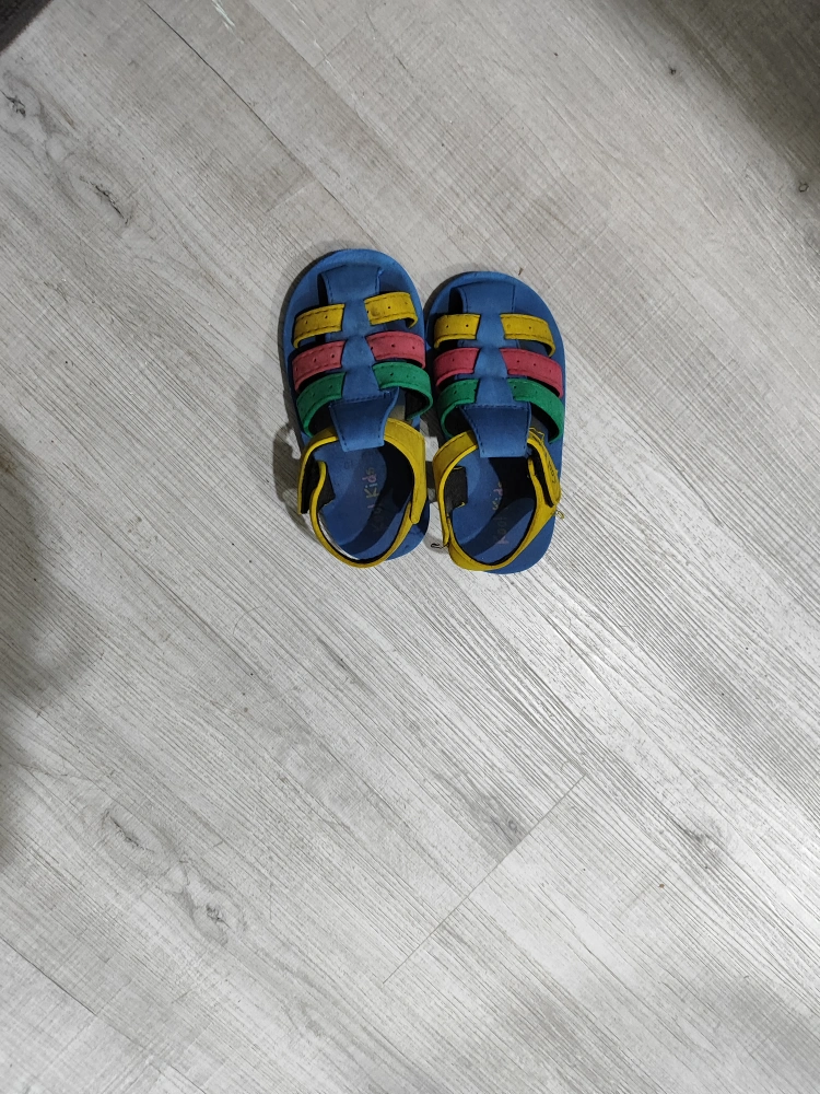 Pair of toddler sandals. Blue, yellow, red and green accents. Adjustable straps. Size 21.