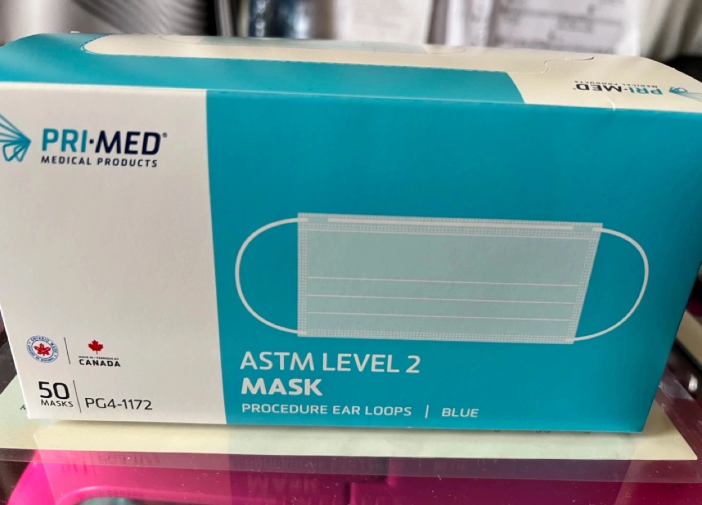 Box of 50 Pri-Med ASTM Level 2 procedure masks. Blue, with ear loops. PG4-1172.