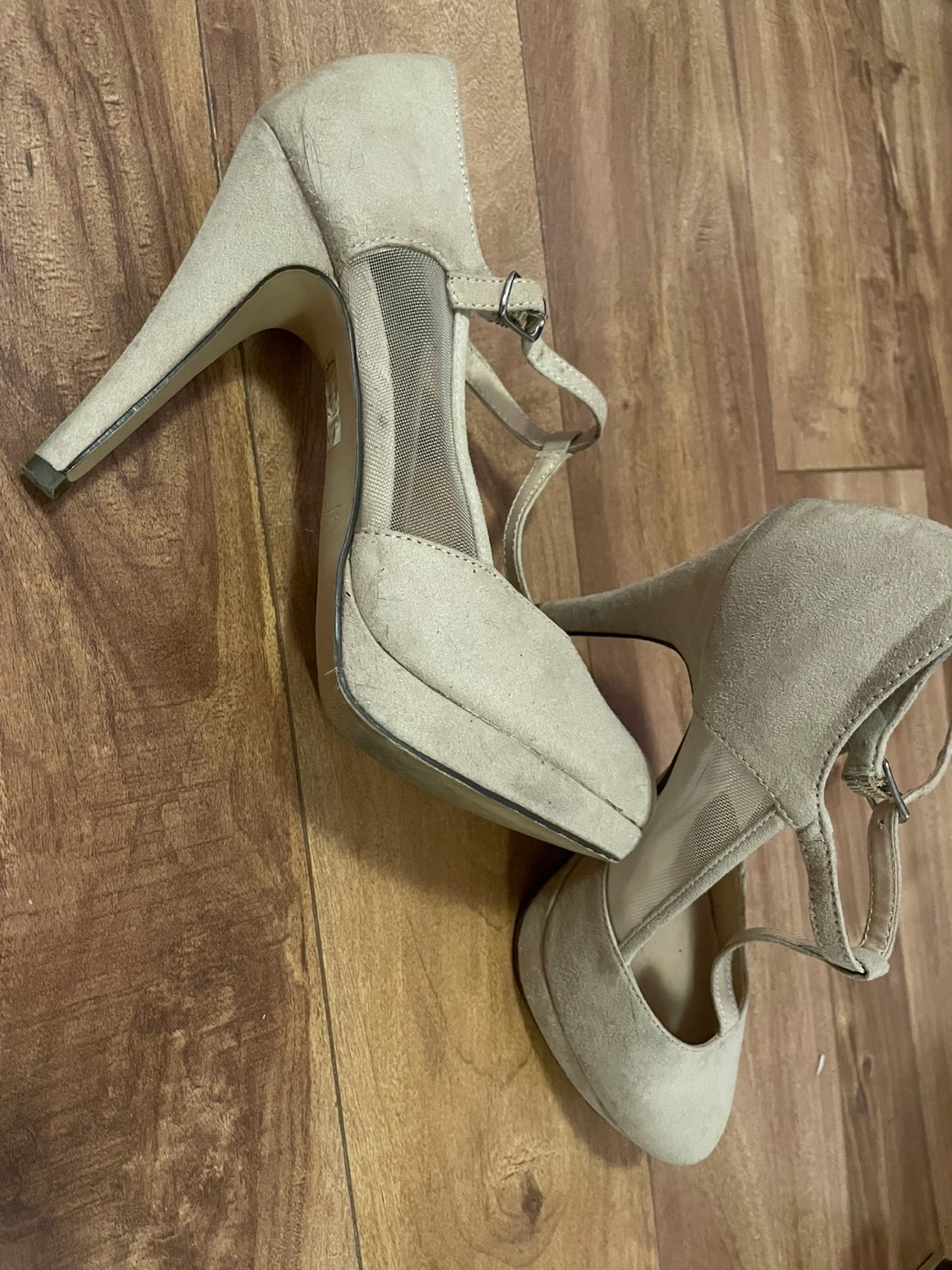 Beautiful beige suede high heels. T-strap design with mesh detail. Elegant and stylish footwear. Perfect for a special occasion.