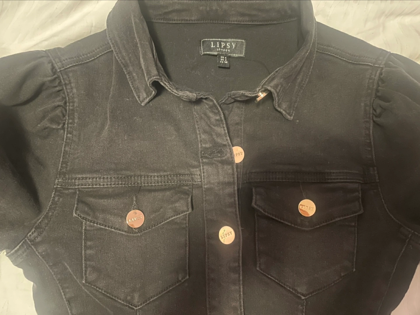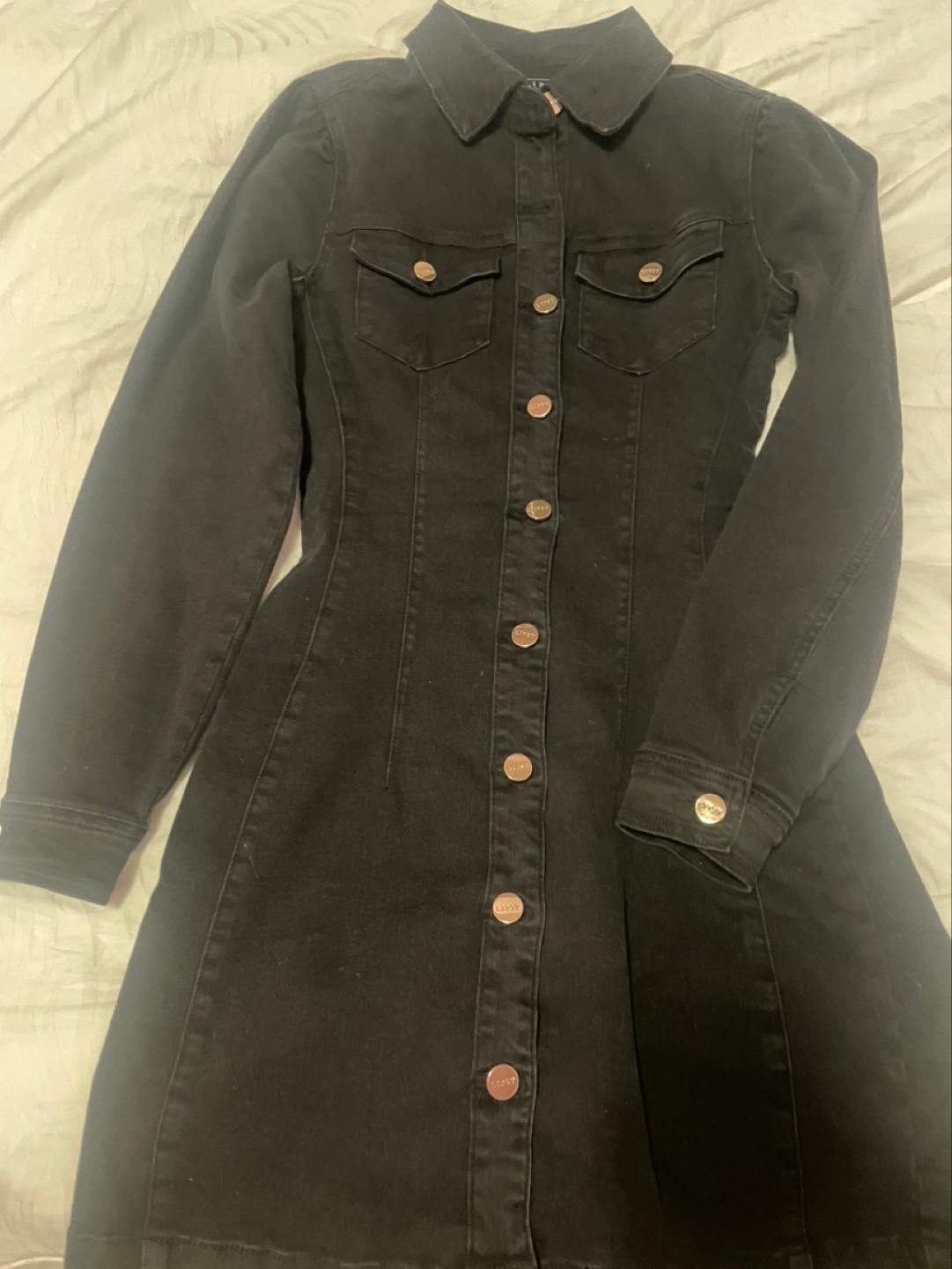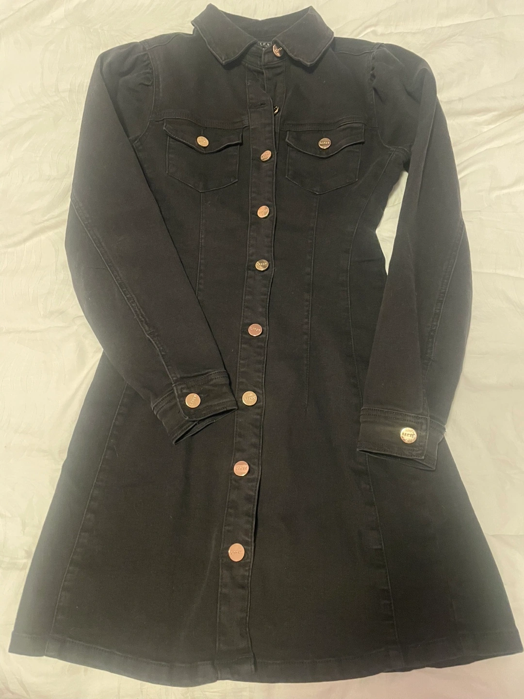 Brand new black denim dress. Long sleeves, button front. Puff shoulders.