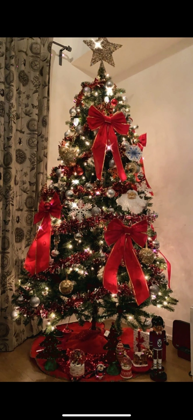 Beautiful large artificial Christmas tree. Pre-lit with warm white lights. Features many red bows, silver and gold ornaments, and tinsel. Tree is decorated and ready to display.