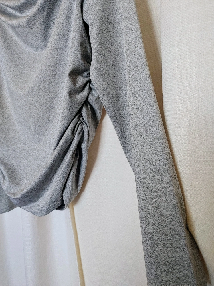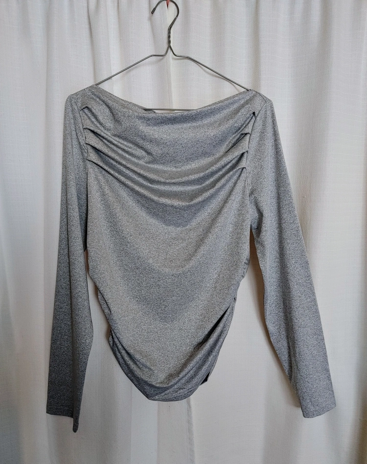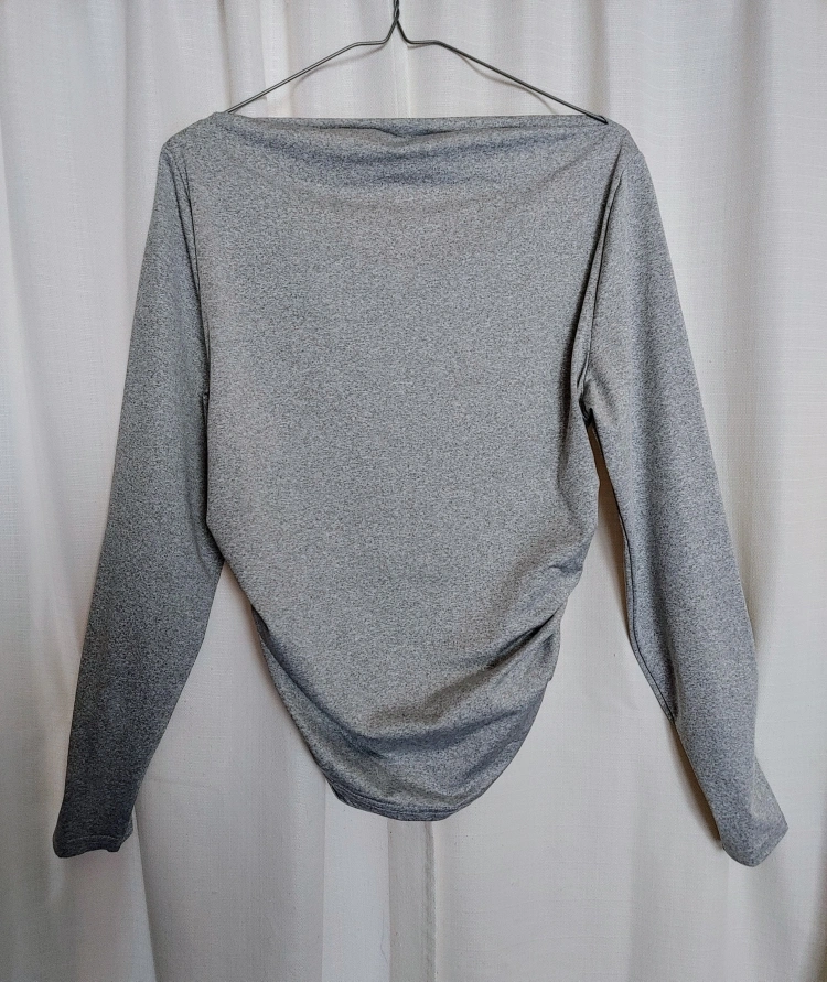 Fitted ruched long sleeve top. Grey melange fabric with a silky feel. Solid slim, with an elegant boat neck detailing. PICKUP Only Weston area. Comes from a clean, bug free, smoke free, kitty friendly home. Willing to meet curbside. Cash is preferable, Exact change ONLY. E-transfer welcome.