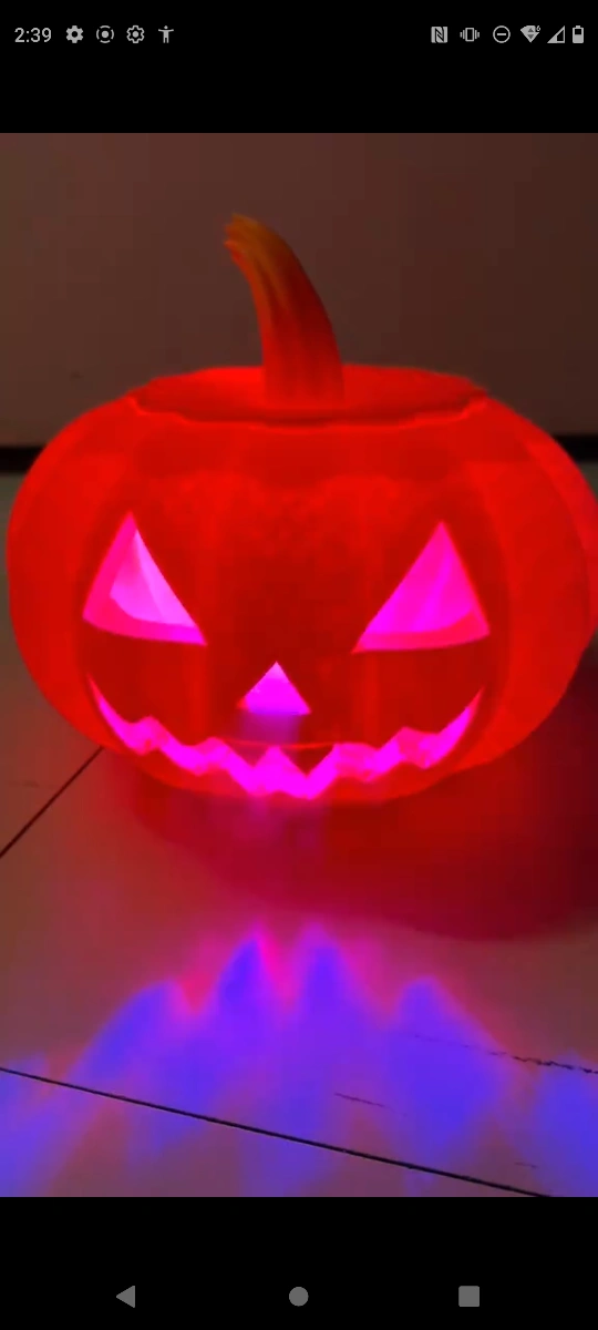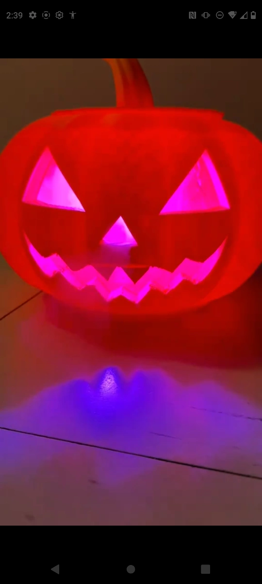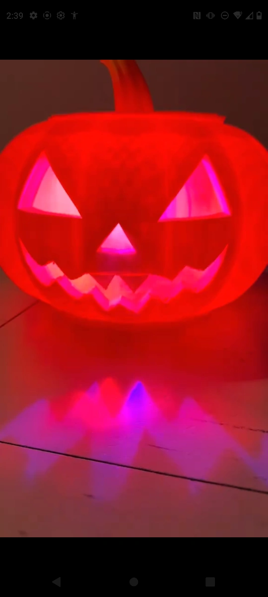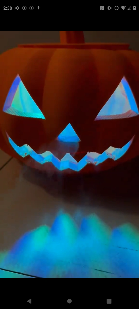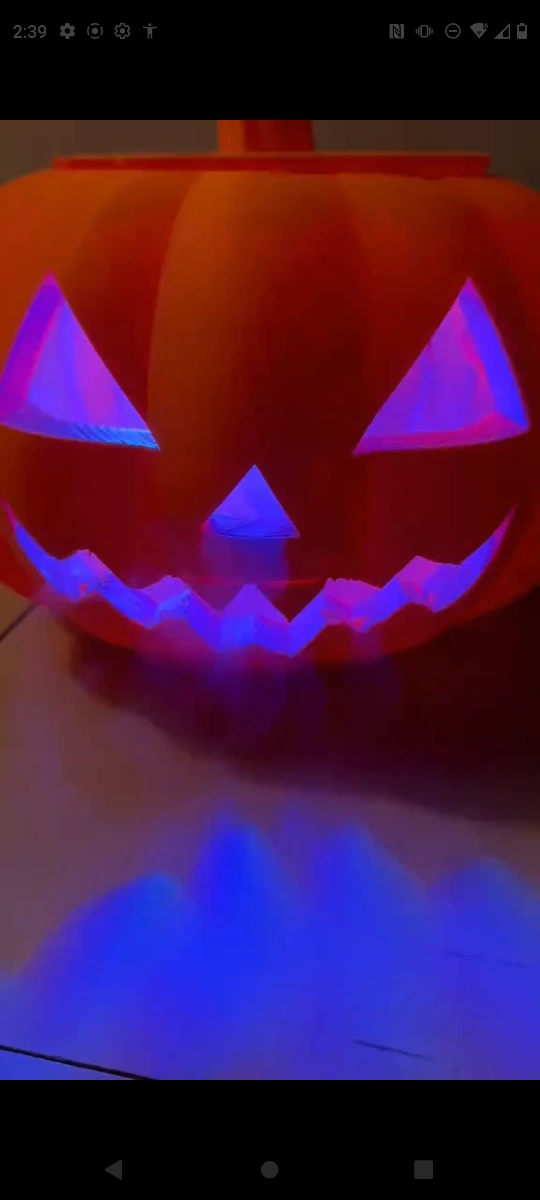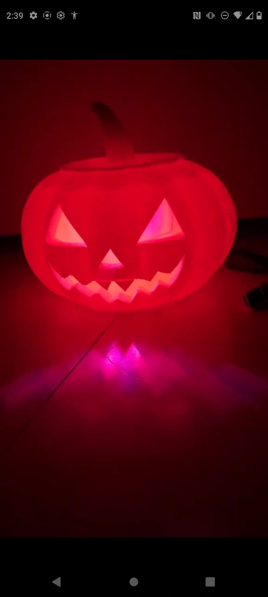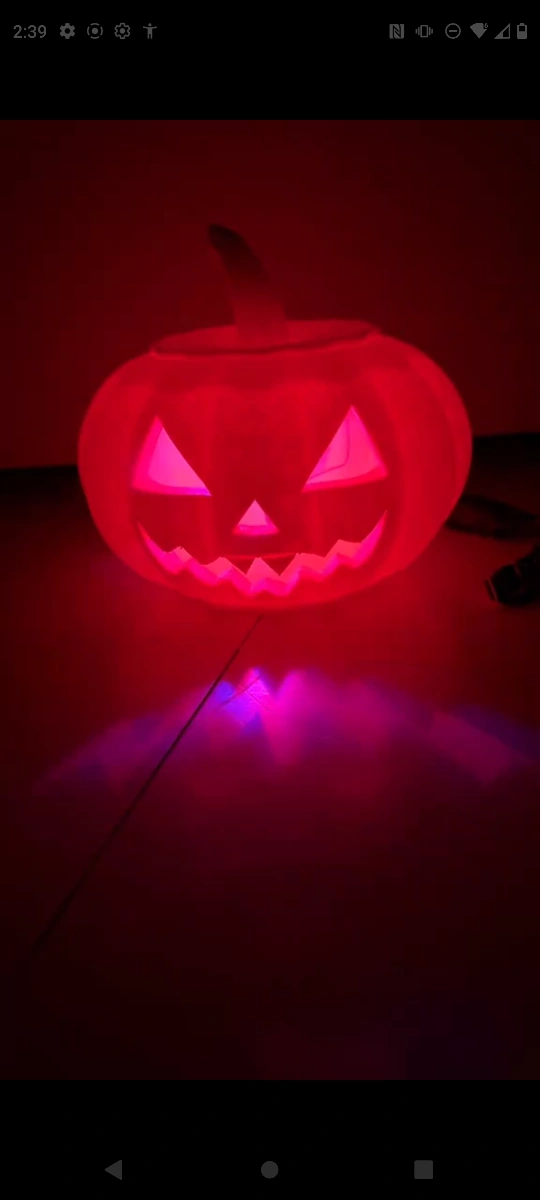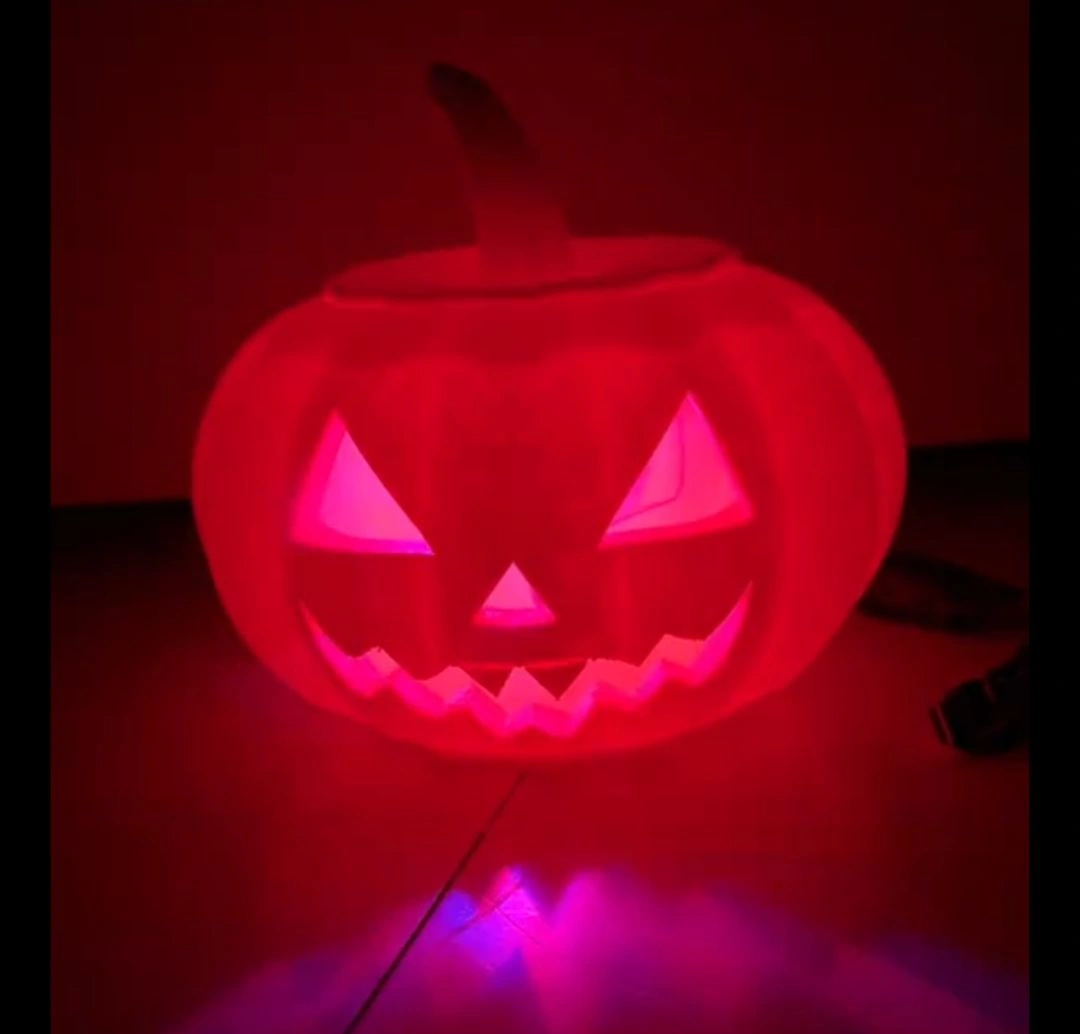 Plastic Halloween pumpkin. Features a carved jack-o'-lantern face and lights up. Colour changing lights. Great for indoor or outdoor use. Perfect for your autumn decor. Add water in the bottom for Fog effects. Plugs in with USB and comes with Remote control for customization of lights.