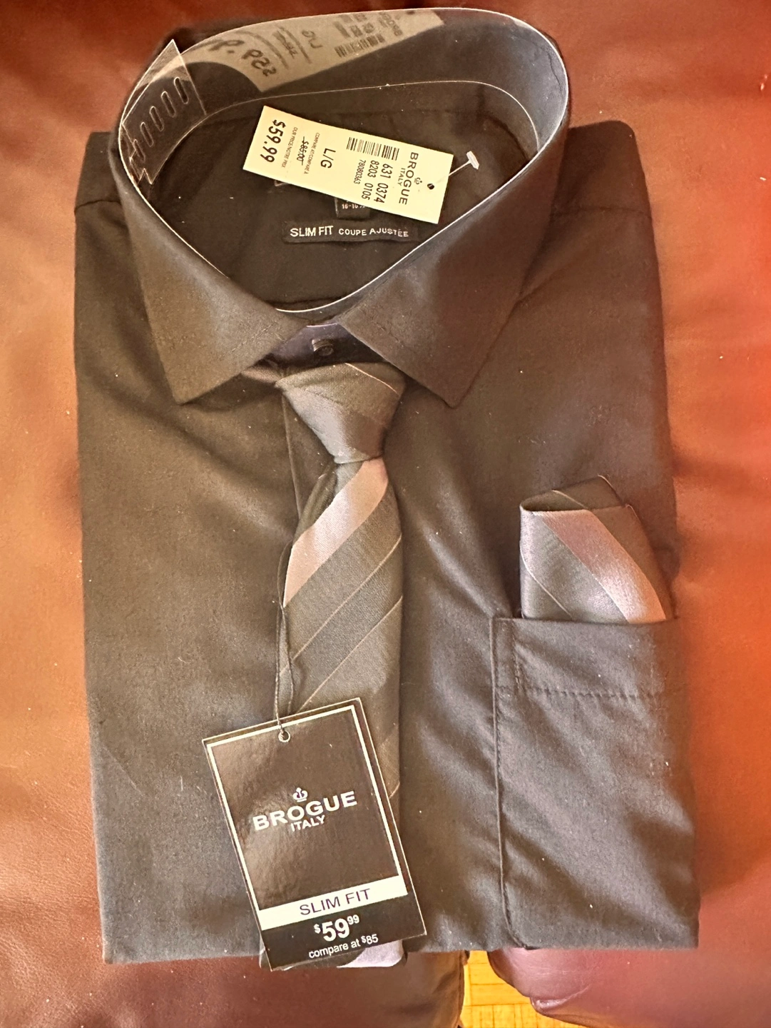Men's black dress shirt and tie set. Slim fit. Large size. Includes matching pocket square.