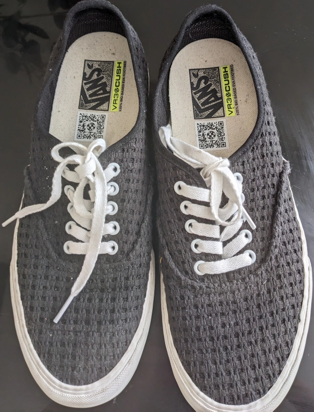 Pair of black Vans sneakers. Woven fabric upper. White laces. VR3Cush insole. Size not specified.