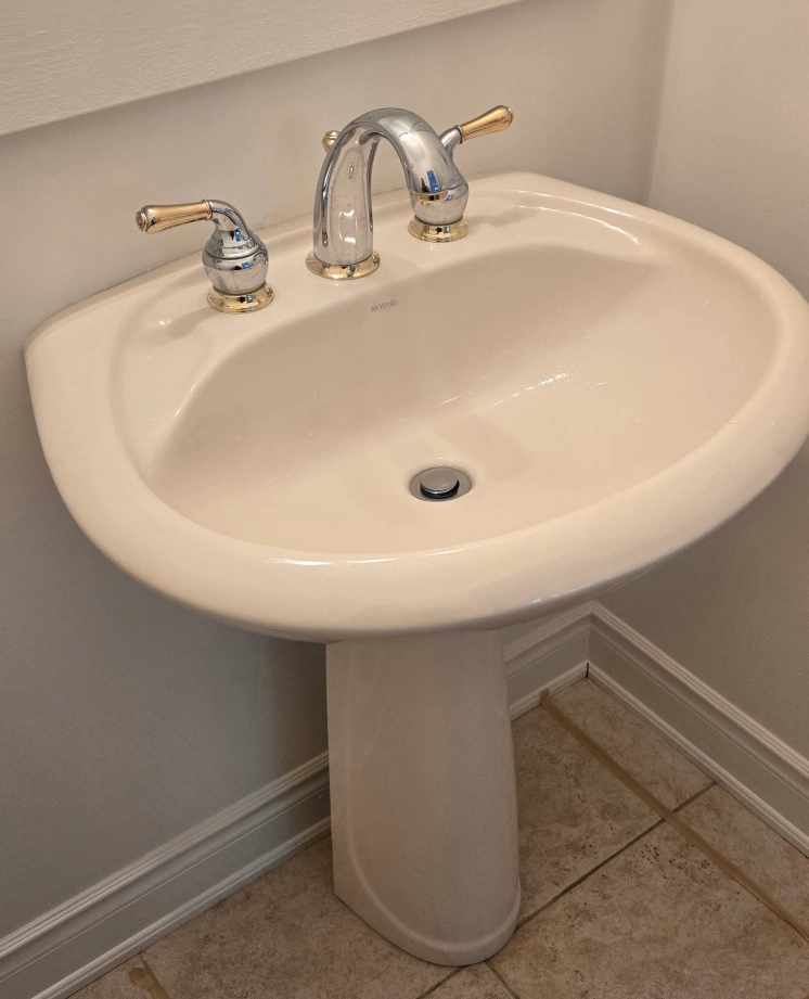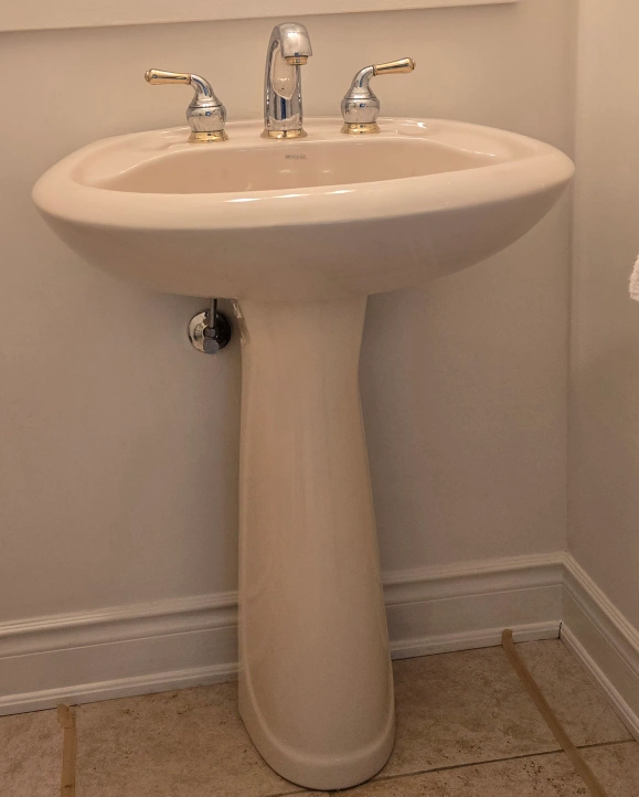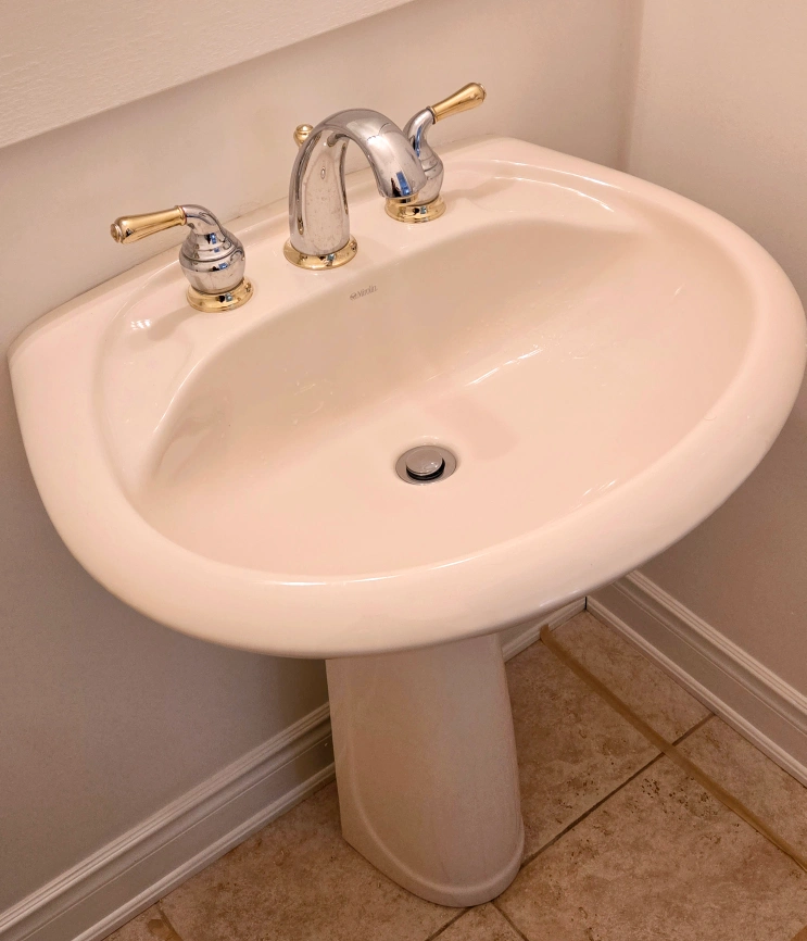 Cream coloured pedestal sink. Includes a three-piece faucet set. W 25 Depth 19 H 32 inches