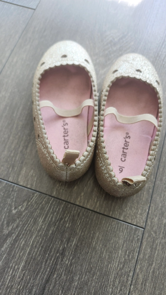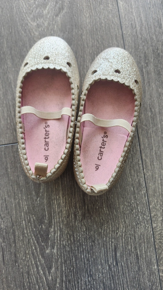 Adorable gold glitter ballerina flats. Pink insole. Scalloped edges. Perfect for a special occasion.